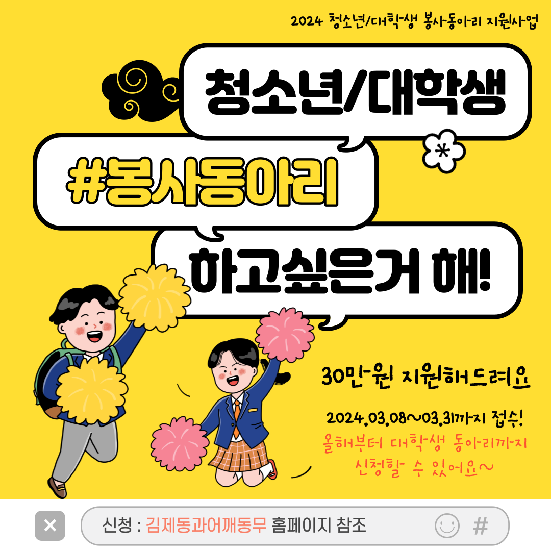 청소년/대학생 봉사동아리 물품지원 사업 공고 (30만원 상당)작성자 : 박세미 작성일 : 24-03-05