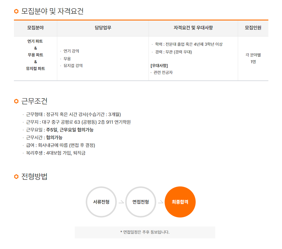 911 연기학원에서 연기 강의, 무용 강의, 뮤지컬 강의 담당 선생님과 담당 선생님을 모집합니다.작성자 : 이승준 작성일 : 24-03-07