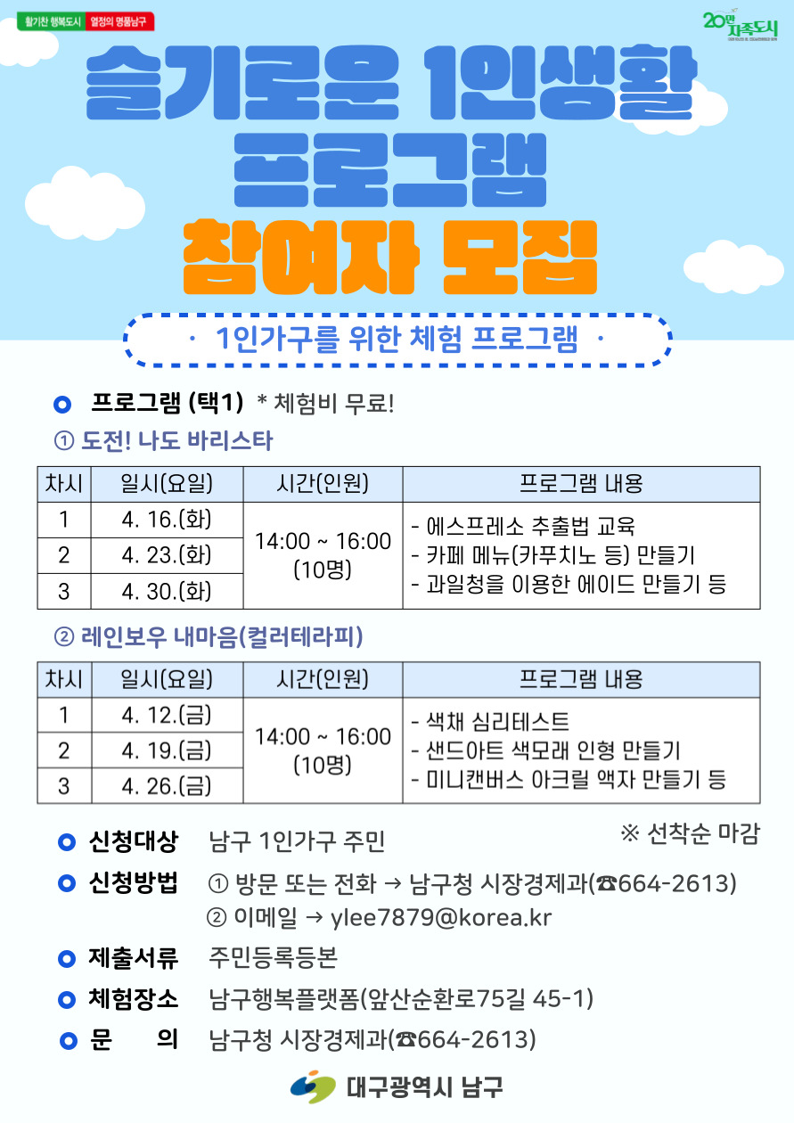 [남구청] 1인가구 "바리스타/컬러테라피" 프로그램 참여자 모집작성자 : 김예리 작성일 : 24-03-20