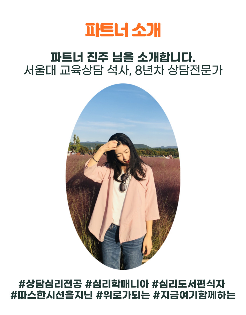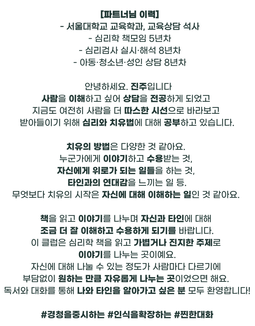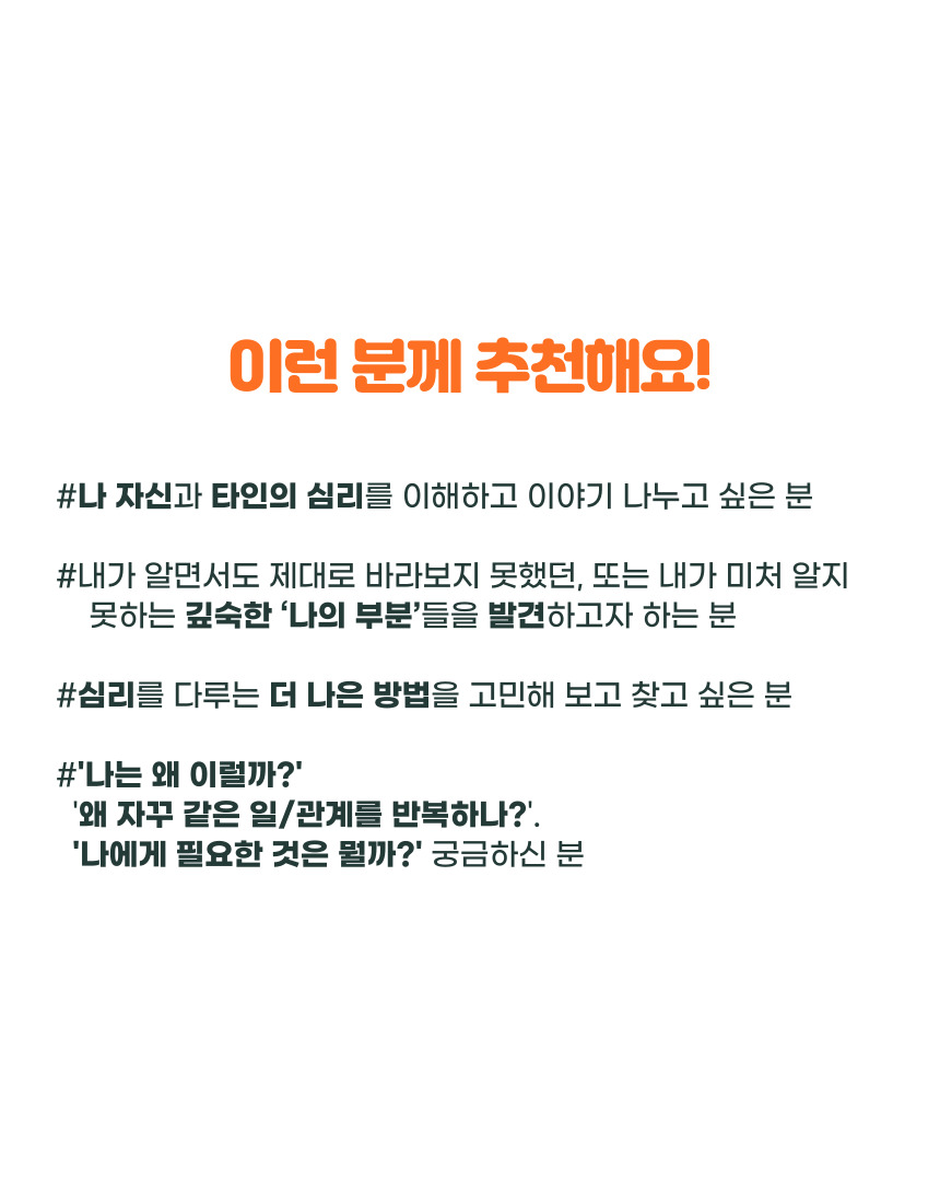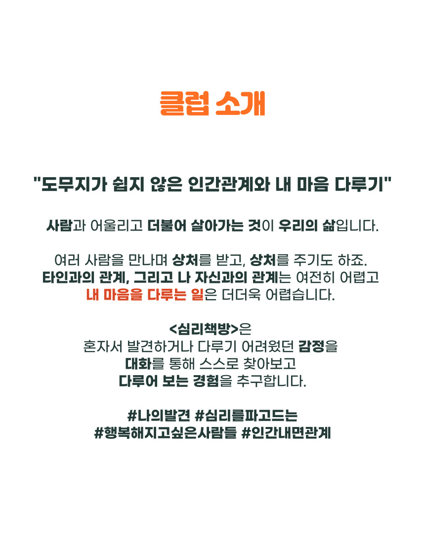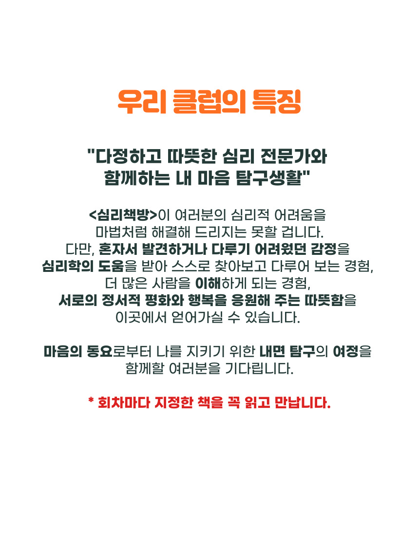 혼자서 발견하거나 다루기 어려웠던 감정을 심리학의 도움을 받아 스스로 찾아보고 다루어 보는 경험, 더 많은 사람을 이해하게 되는 경험, 서로의 정서적 평화와 행복을 응원해 주는 따뜻함을 이곳에서 얻어가실 수 있습니다. 마음의 동요로부터 나를 지키기 위한 심리 대화를 함께 할 여러분을 기다립니다.