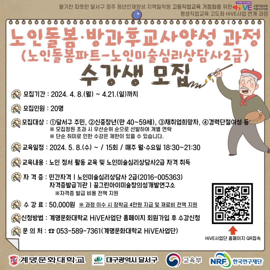 [HiVE] 노인돌봄·방과후교사양성 과정(1차) 수강생 모집작성자 : 조정원 작성일 : 24-04-08
