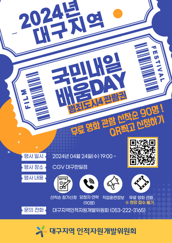 대구지역인적자원개발위원회가 주최하는 행사 참여해서 무료 영화도 보고!