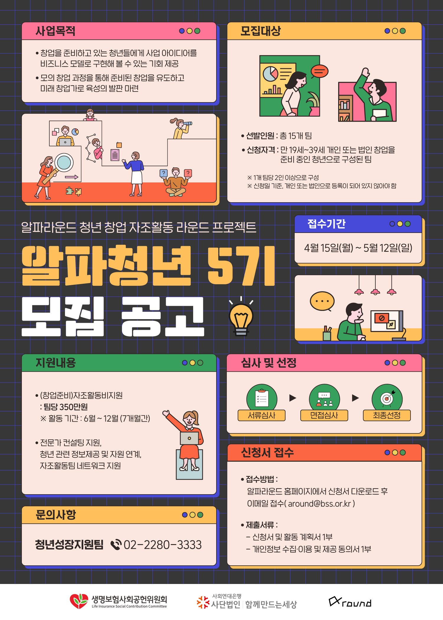 - 접수방법: 알파라운드 홈페이지에서 신청서 다운로드 후 이메일 접수(around@bss.or.kr)