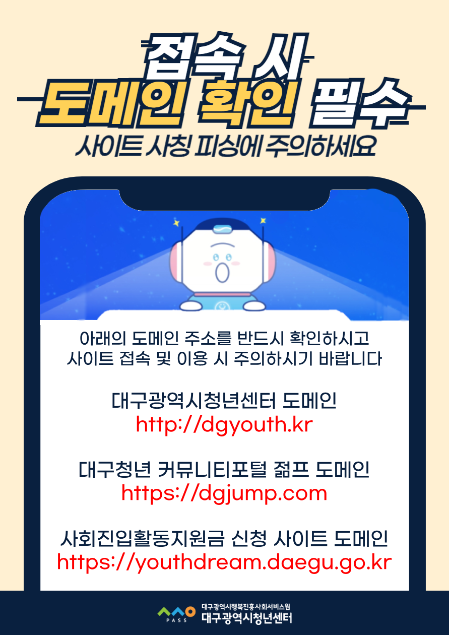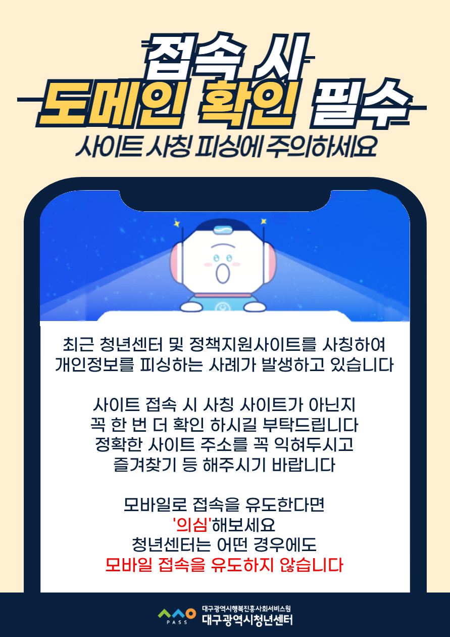 피싱 사이트 주의 안내작성자 : 대구청년센터 작성일 : 24-04-18 대구광역시청년센터