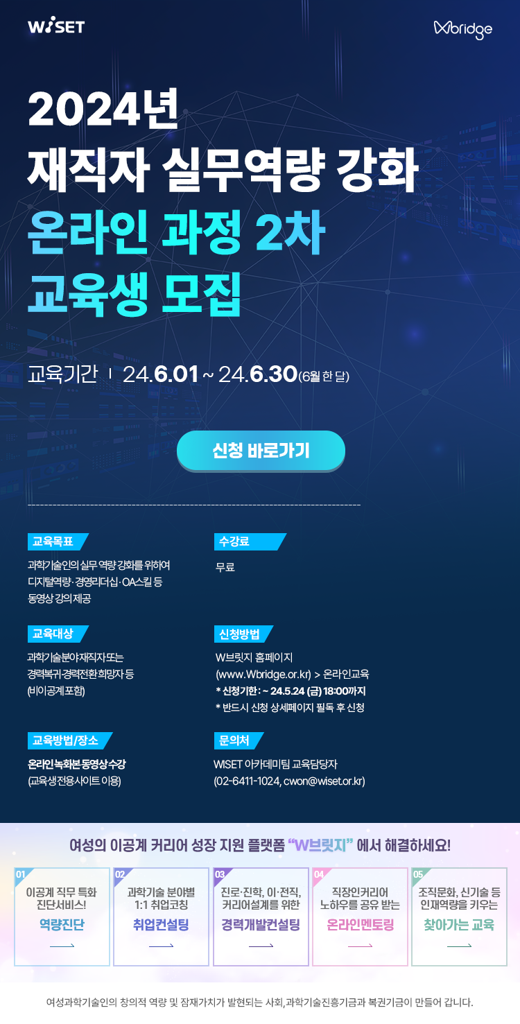 [WISET] 2024년 재직자 실무역량 강화를 위한 온라인 과정 2차 (신청기간 ~ 5/24)작성자 : 이한빛 작성일 : 24-05-02