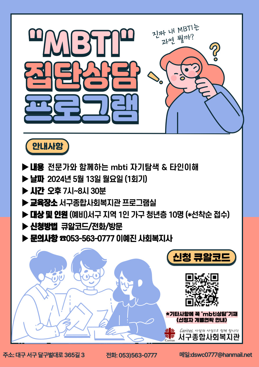 청년 MBTI 집단상담 참여자 모집!작성자 : 이예진 작성일 : 24-05-04