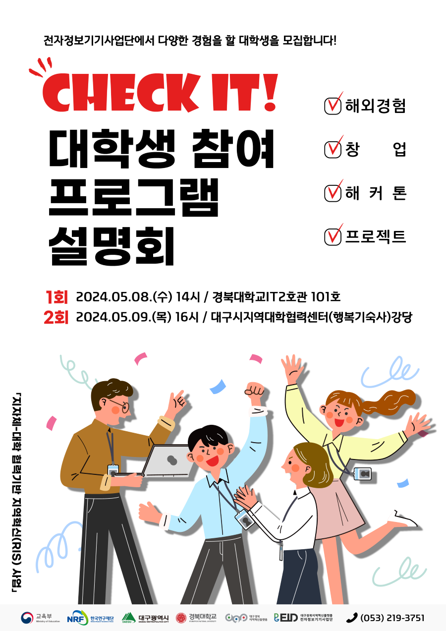 「지자체-대학 협력기반 지역혁신(RIS) 사업」을 수행하고 있는 대구경북지역혁신플랫폼 전자정보기기사업단에서 "대학생 참여 프로그램 설명회"를 개최하오니 관심 있는 분들의 많은 참석 바랍니다.
