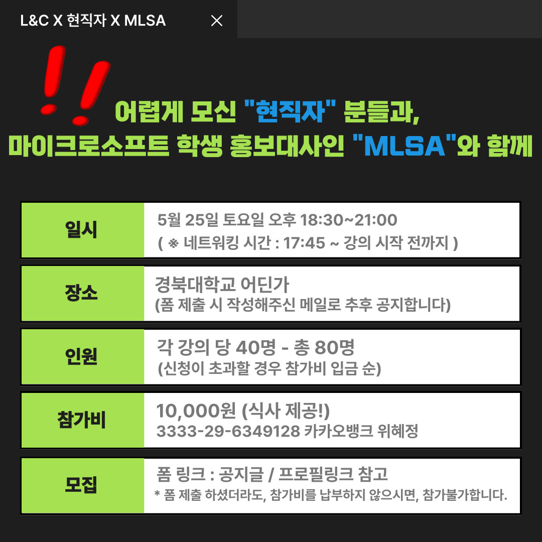 이번 세미나는 어렵게 모신 "현직자" 분들과 마이크로소프트 학생 홍보대사인 "MLSA"와 함께 진행합니다!