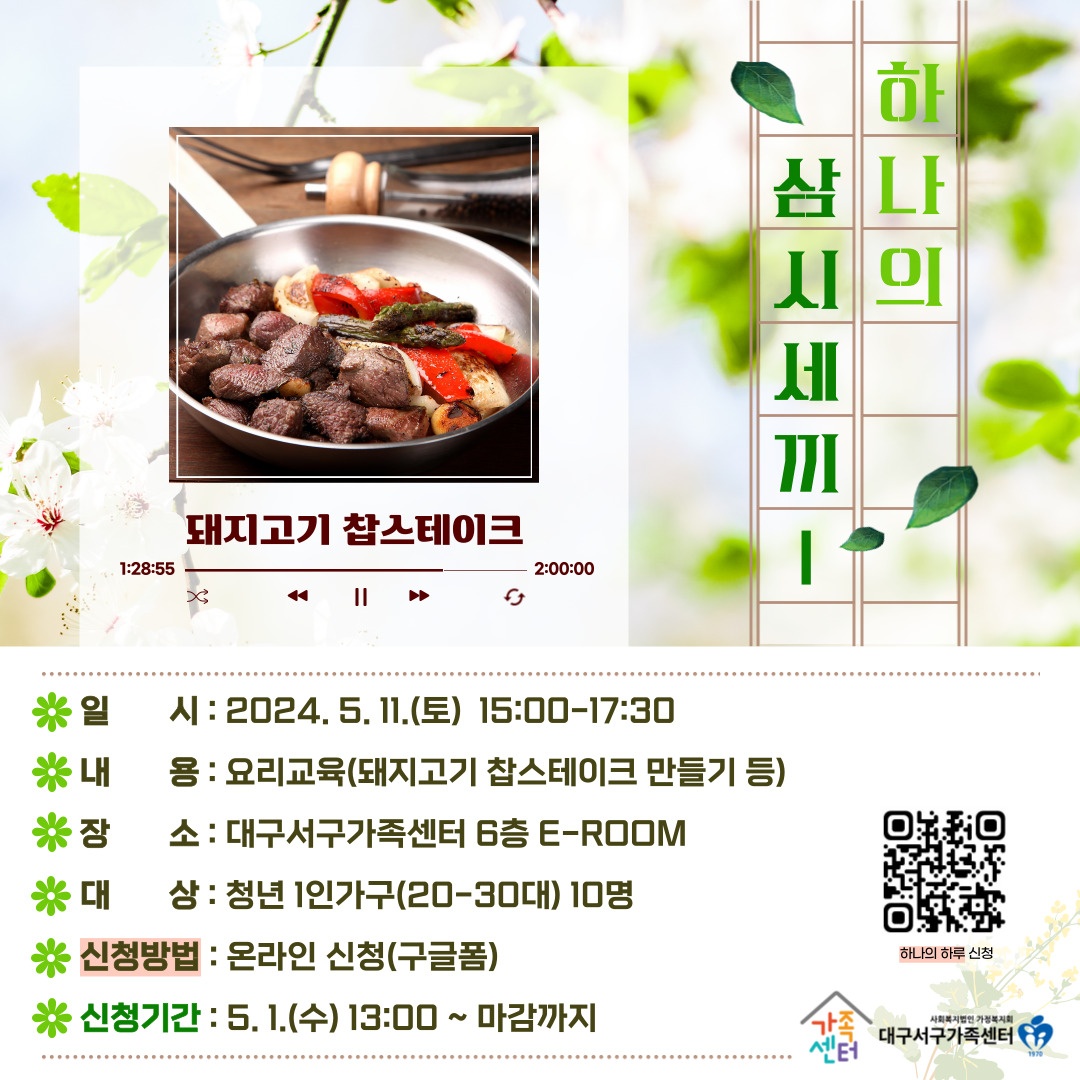 [대구서구가족센터] 청년 1인가구 "하나의 삼시세끼" 1회기 추가모집작성자 : 장준익 작성일 : 24-05-09