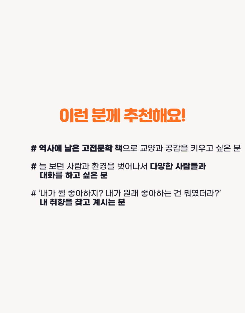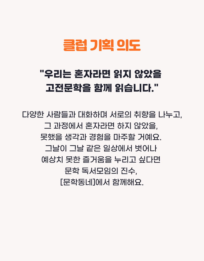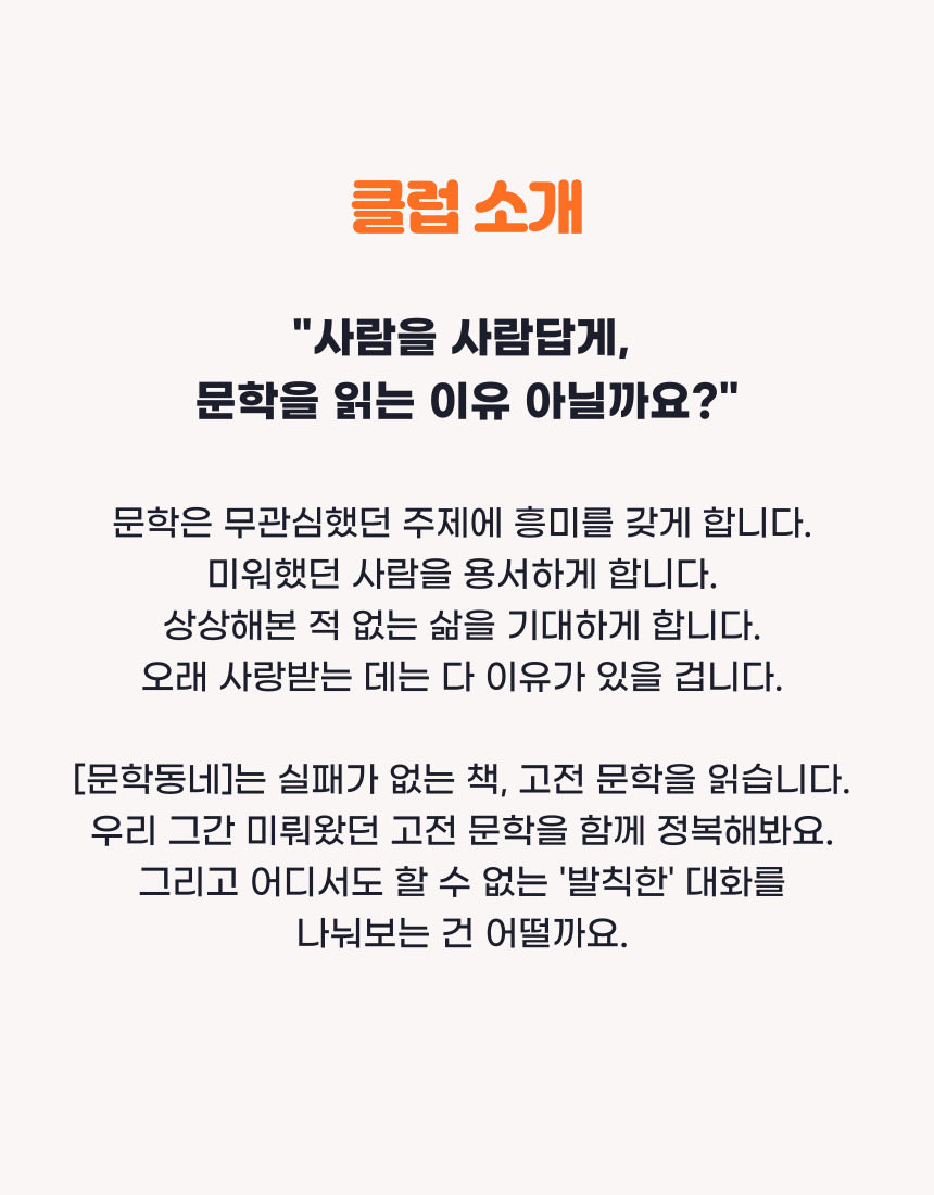 문학은 무관심했던 주제에 흥미를 갖게 합니다. 미워했던 사람을 용서하게 합니다. 상상해본 적 없는 삶을 기대하게 합니다. 오래 사랑받는 데는 다 이유가 있을 겁니다. [문학동네]는 실패가 없는 책, 고전 문학을 읽습니다. 우리 그간 미뤄왔던 고전 문학을 함께 정복해봐요. 그리고 어디서도 할 수 없는 '발칙한' 대화를 나눠보는 건 어떨까요.