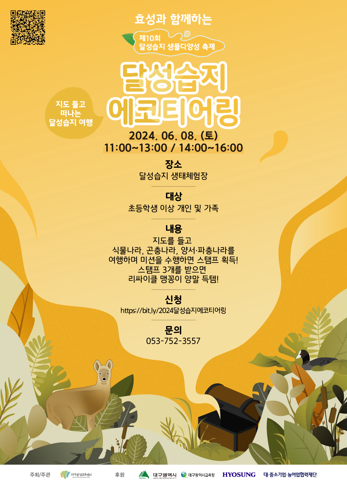 달성습지 에코티어링(ecoteering)프로그램은 생태(eco)와 오리엔티어링(orienteering)이 합쳐진 단어로, 자연 안에서 미션을 수행하면서 지역생태계를 주체적으로 알아가는 환경교육 프로그램입니다. 제10회 달성습지 생물다양성축제에서 만나보아요!