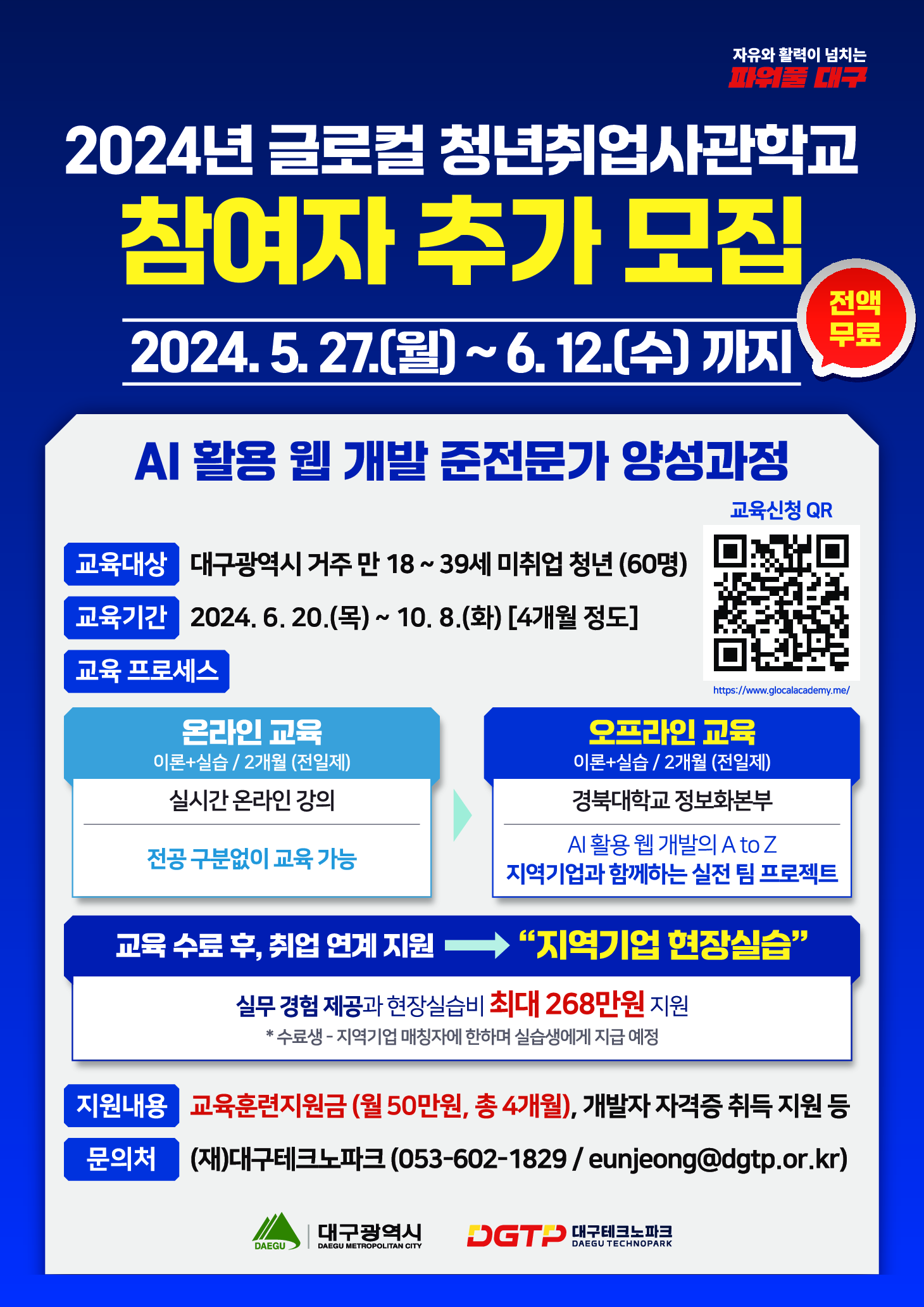 2024년 글로컬 청년취업사관학교 참여자 추가모집 공고작성자 : 박은정 작성일 : 24-05-28