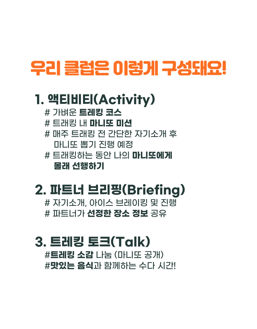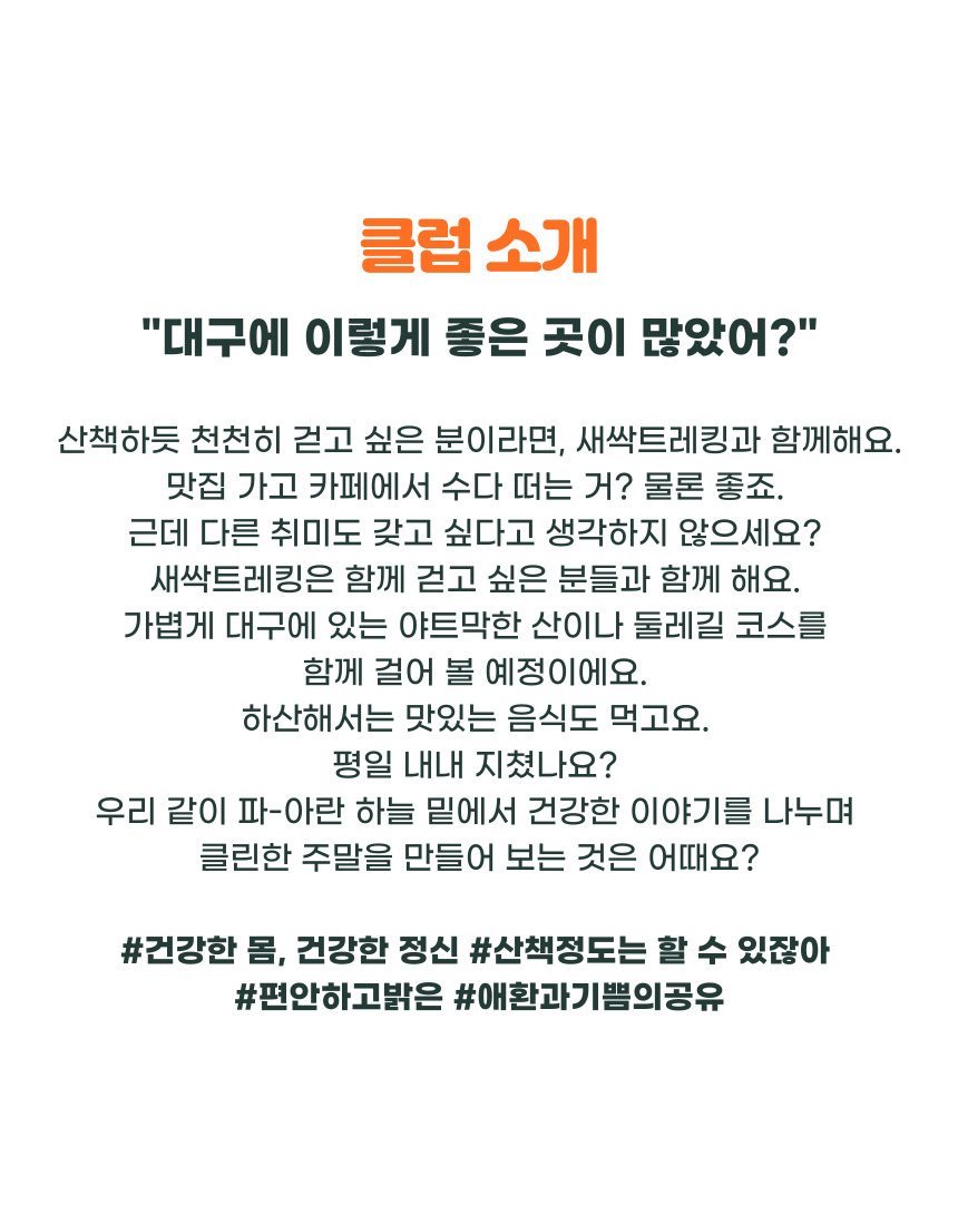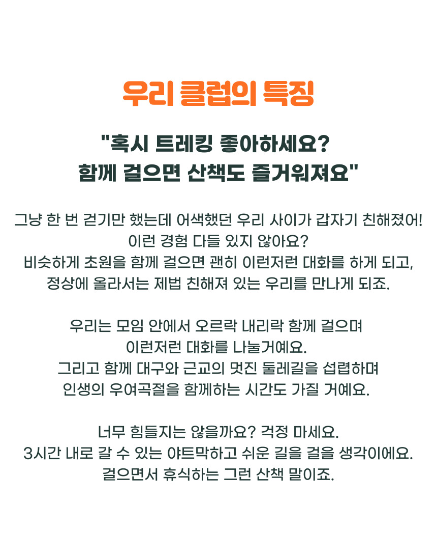 산책하듯 천천히 걷고 싶은 분이라면, 새싹트레킹과 함께해요. 맛집 가고 카페에서 수다 떠는 거? 물론 좋죠. 근데 다른 취미도 갖고 싶다고 생각하지 않으세요? 평일 내내 지쳤나요? 우리 같이 파-아란 하늘 밑에서 건강한 이야기를 나누며 클린한 주말을 만들어 보는 것은 어때요?