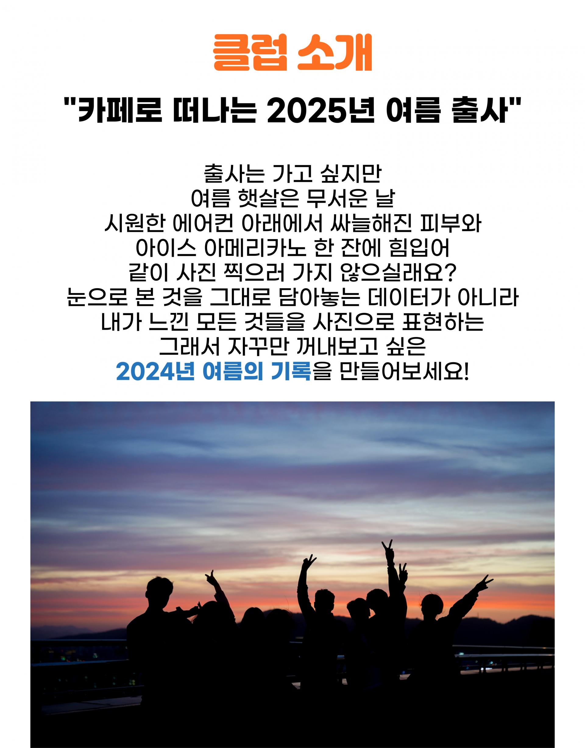 출사는 가고 싶지만 여름 햇살은 무서운 날, 시원한 에어컨 아래에서 싸늘해진 피부와 아이스 아메리카노 한 잔에 힘입어 같이 사진 찍으러 가지 않으실래요? 눈으로 본 것을 그대로 담아놓는 데이터가 아니라, 내가 느낀 모든 것들을 사진으로 표현하는 그래서 자꾸만 꺼내보고 싶은 2024년 여름의 기록을 만들어보세요!
