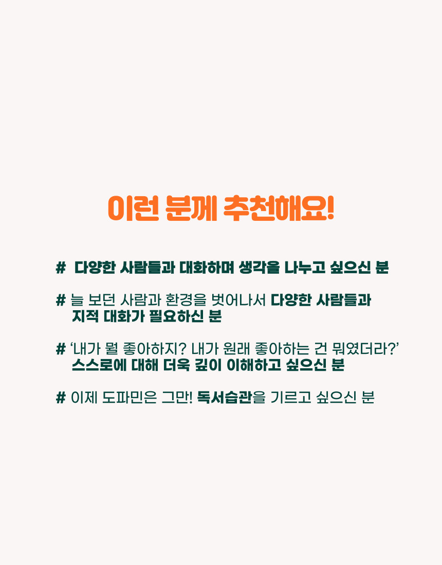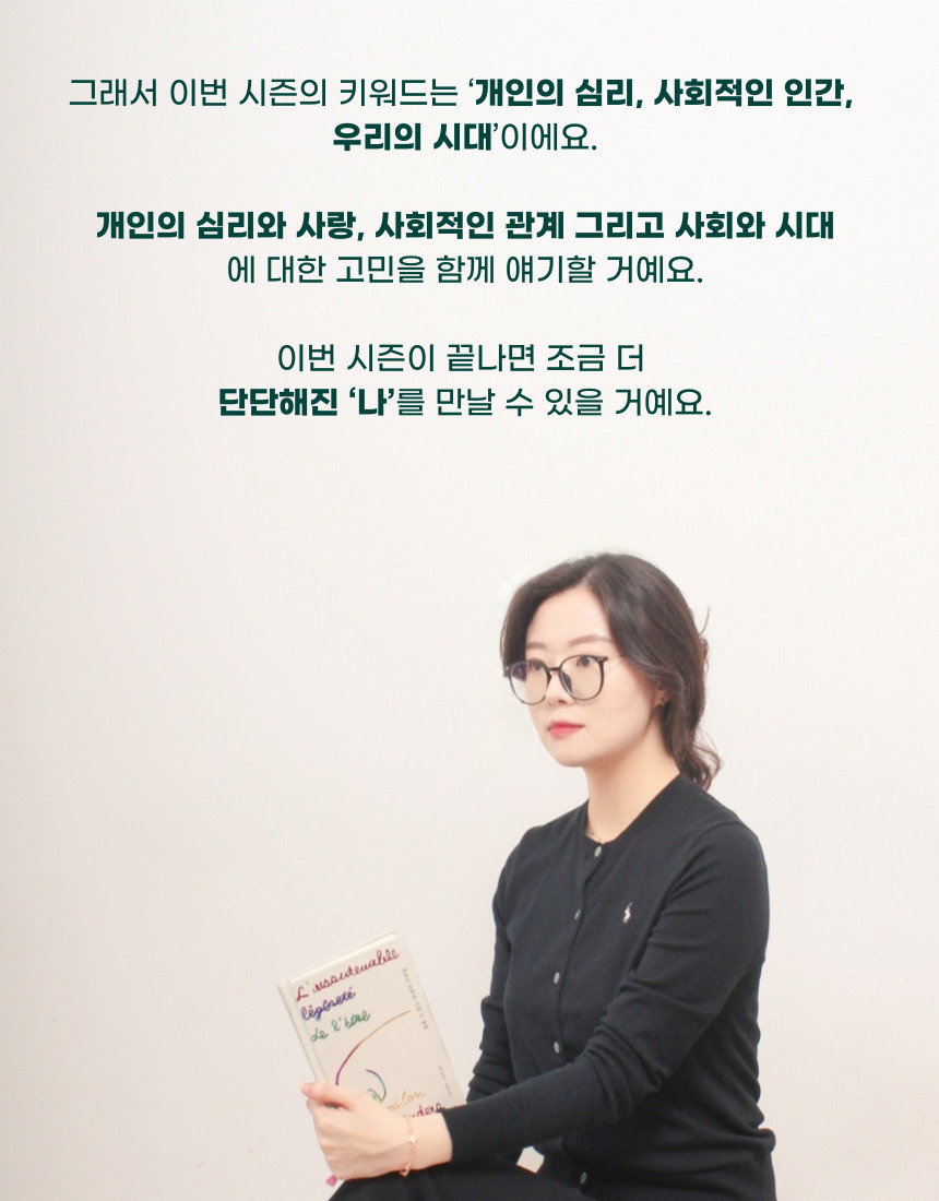일요일 나른한 오후 독서와 함께 나를 이해해봐요. 나를 제대로 이해하면 타인을 이해할 수 있는 힘도 생겨요. 여름의 화창한 햇살처럼 따뜻한 언어로 마음을 채워나가면, 시즌이 끝나고 좀 더 행복하고 단단해진 나를 만날 수 있을 거예요.
