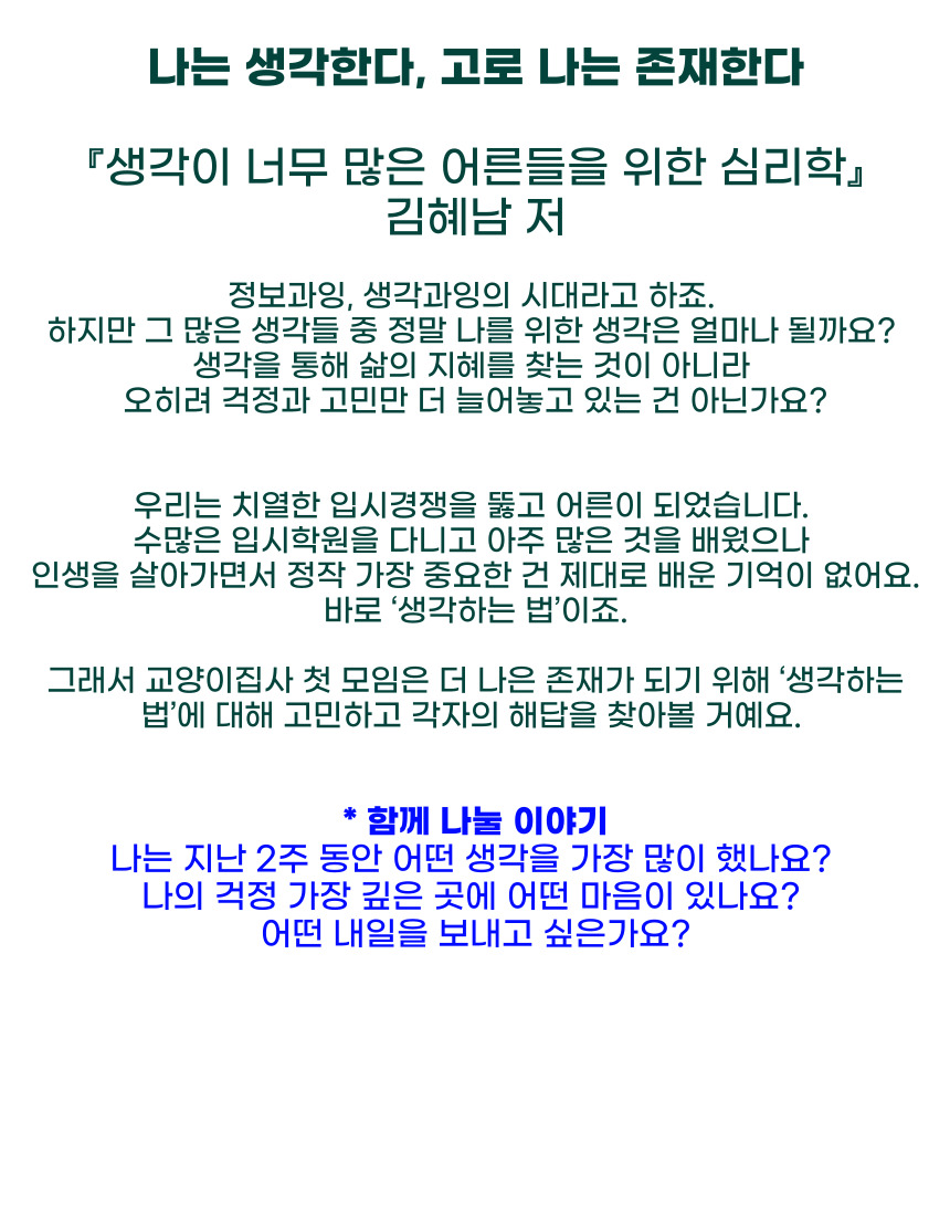 * 읽고 올 책 : 『생각이 너무 많은 어른들을 위한 심리학』