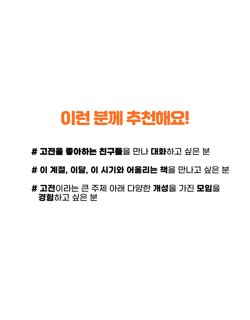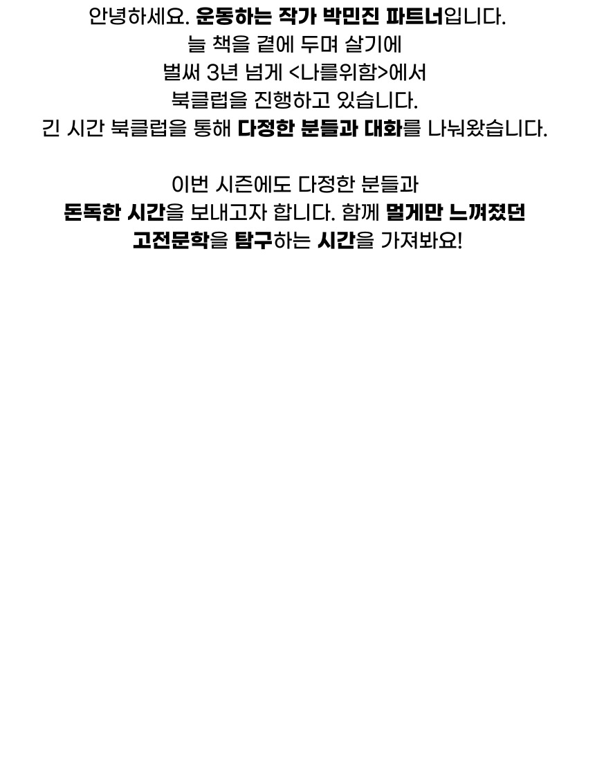 실패가 없는 책, 고전 문학을 읽습니다. 그리고 어디서도 할 수 없는 발칙한 대화를 나눠봅시다. 남다른 문학 러버 11년 차 파트너와 함께하는 밀도 높은 문학 모임에 함께하세요!