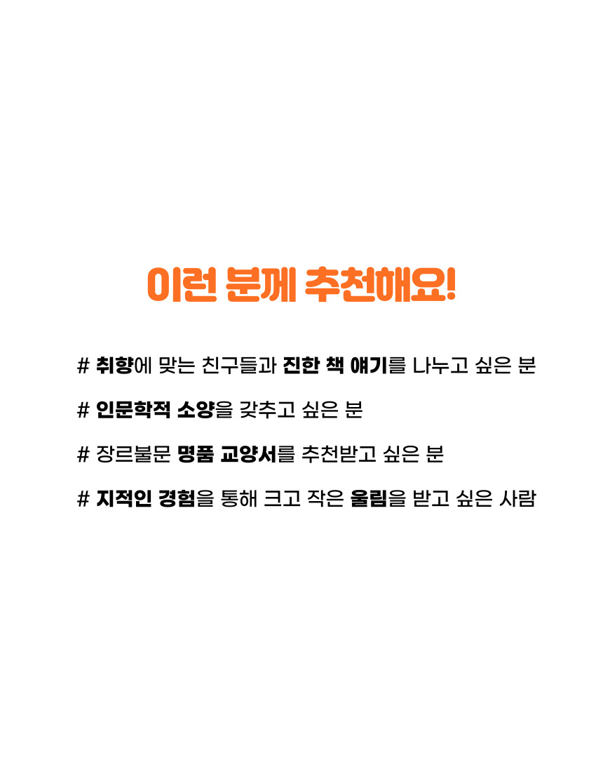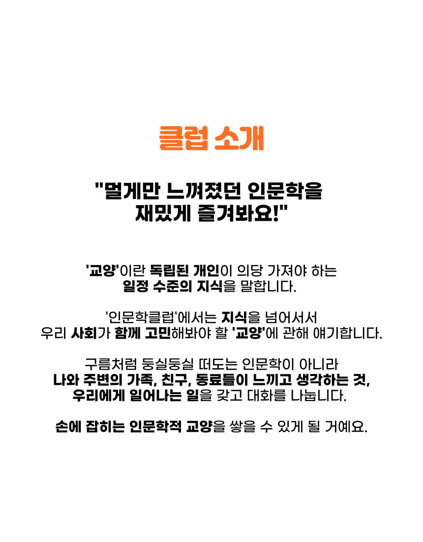 인문학클럽은 살면서 꼭 답하면 좋은 질문들에 관한 대화를 나눕니다. 나만의 기준과 가치관을 바탕으로 자신의 길을 찾는다면, 더 행복하고 의미 있는 삶을 살아갈 수 있습니다. 바쁜 일상에서 잠시나마 책을 읽고 깊은 대화를 나누면서 자기 자신을 돌아보는 시간을 가져보세요. 각자의 경험과 느낌을 진솔하게 나누면서 다양한 가능성을 찾을 수 있을 겁니다.