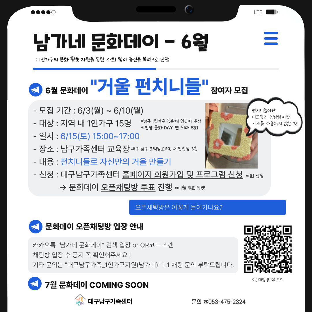 💡신청 방법 : 남구가족센터 홈페이지 "문화데이" 프로그램 신청 후, 남가네 문화데이 오픈채팅방 투표 진행