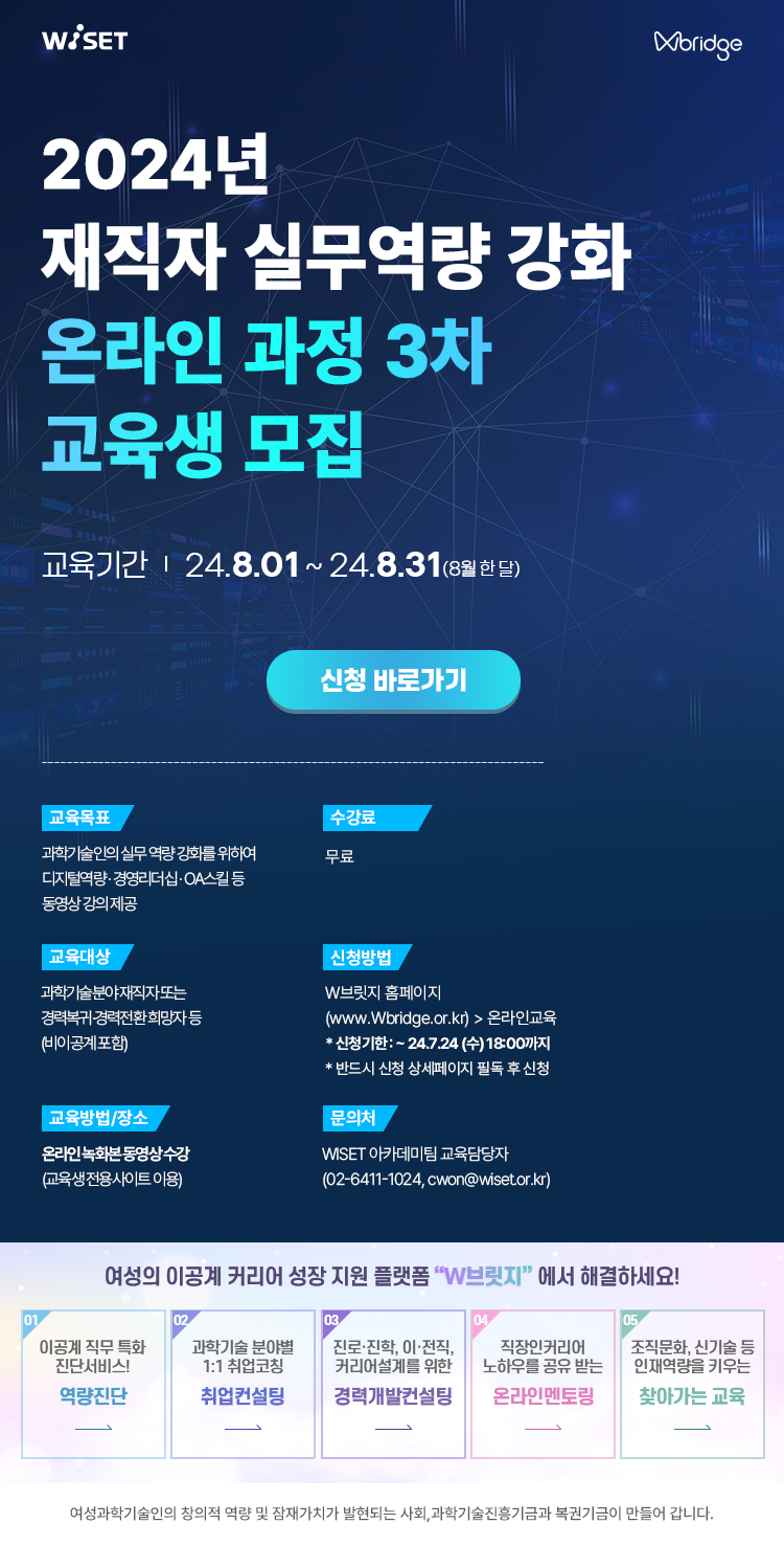 한국여성과학기술인육성재단은 멀티캠퍼스와 공동으로 ‘신기술’, ‘경영·리더십’, ‘OA활용’ 등 다양한 분야에 걸쳐 과학기술분야 재직자의 종합적인 실무 능력 배양을 위한 과정을 마련하였으니 많은 분들의 관심과 신청 바랍니다.