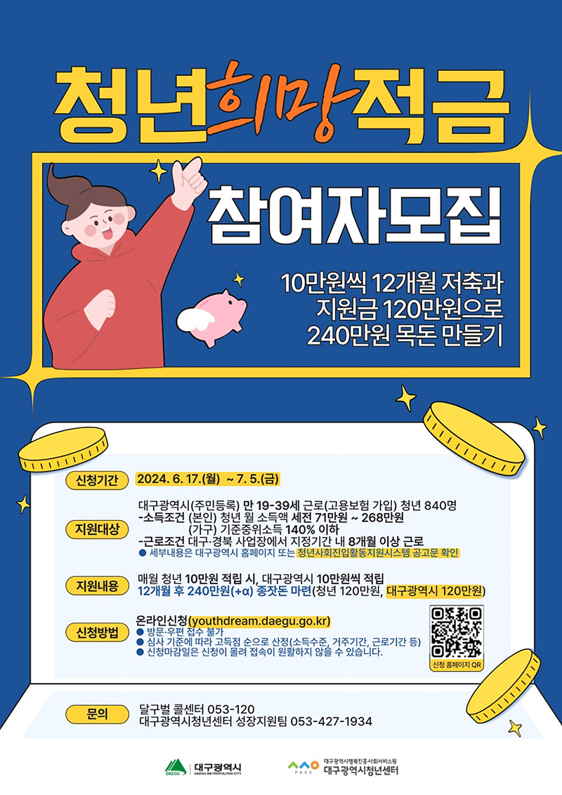 2024년 청년희망적금 참여자 모집공고작성자 : 대구청년센터 작성일 : 24-06-14 대구광역시청년센터