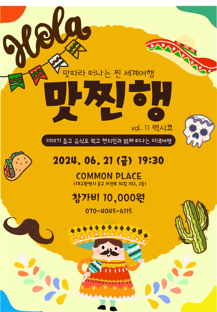 📍행사 내용 : 멕시코 대한 강의, 로컬 음식 및 주류 맛보기, 문화교류📍창가비 : 10,000원 (음식 및 주류 포함)