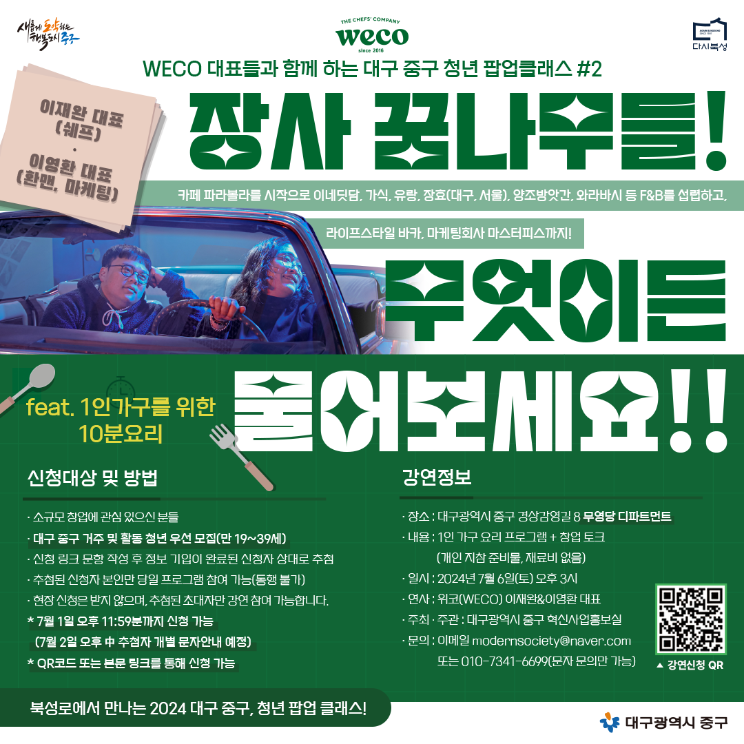 👉대구 중구 청년 팝업 클래스 #2 "장사 꿈나무들! 무엇이든 물어보세요!! feat. 1인가구를 위한 10분 요리" (위코 이재완&이영환 공동대표)