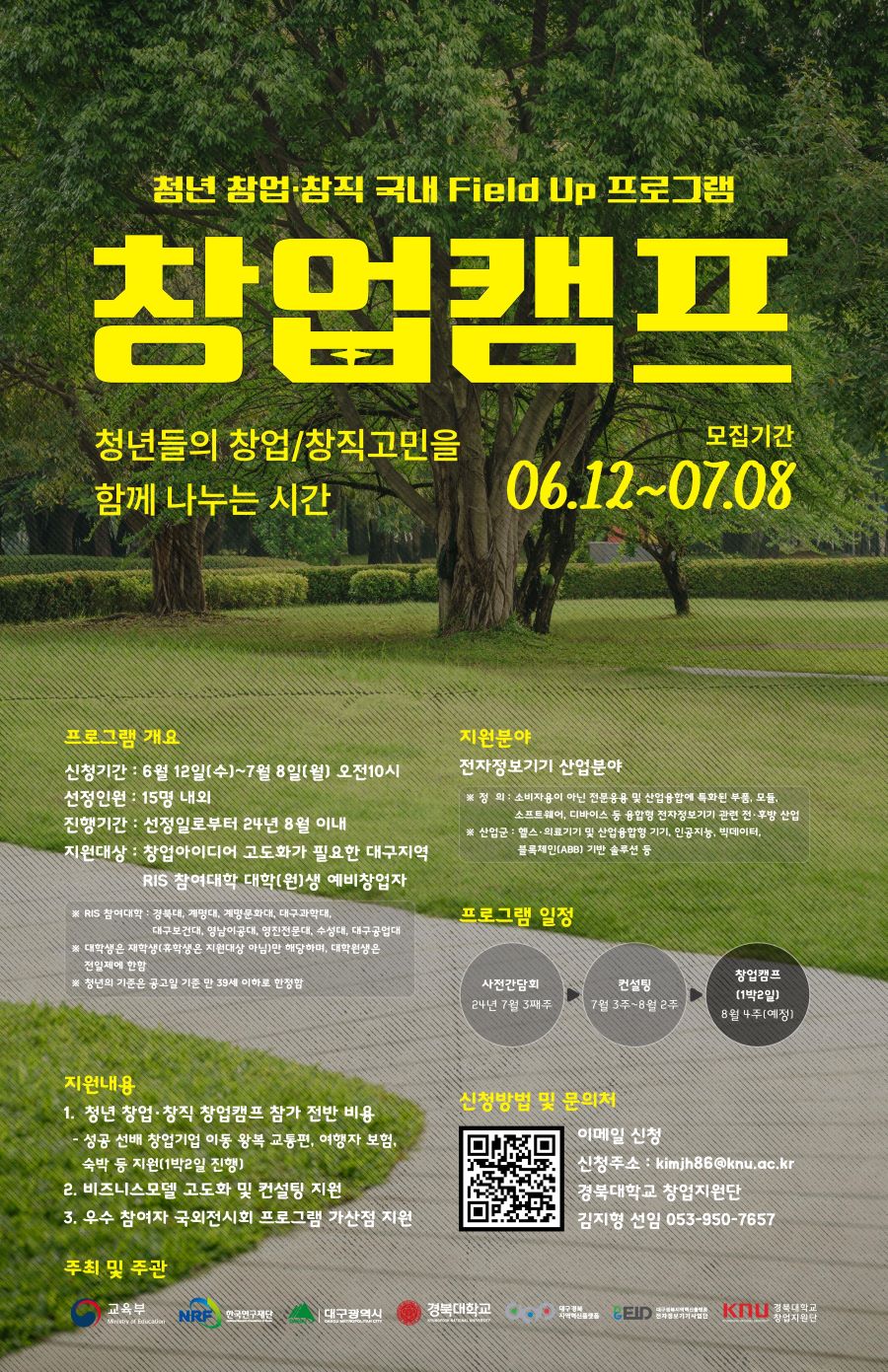청년 창업·창직 창업캠프(국내 Field Up! 프로그램) 참가 예비창업자 모집 (~7/8)작성자 : 이지현 작성일 : 24-06-27