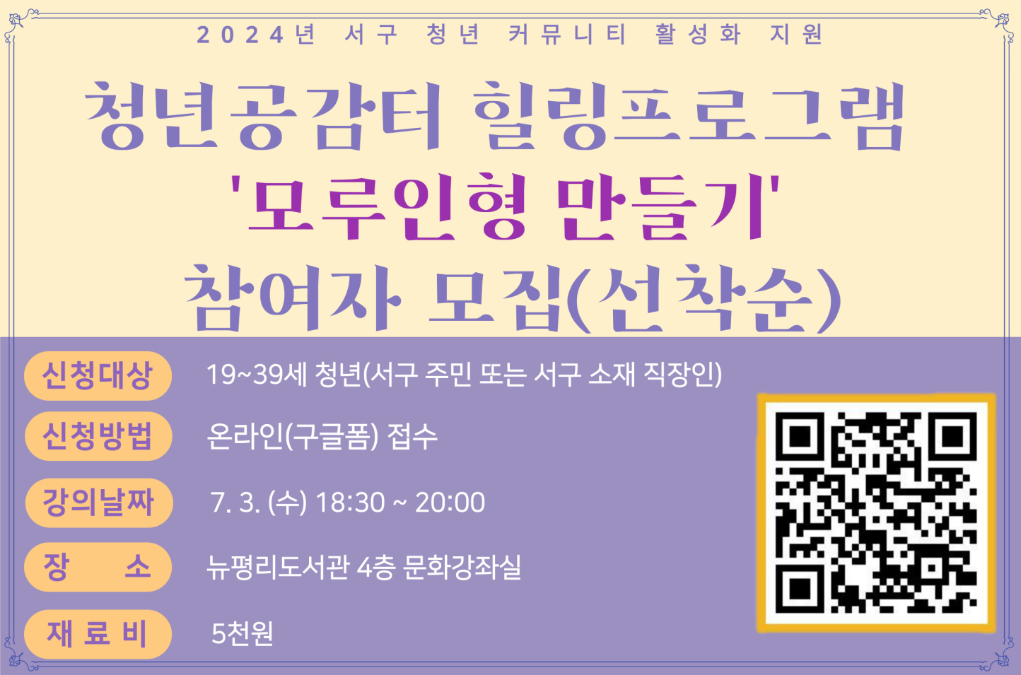 (7.3.수 모루인형만들기 선착순모집)2024년 서구 청년 커뮤니티 활성화 지원 참여자 모집작성자 : 김규연 작성일 : 24-06-29