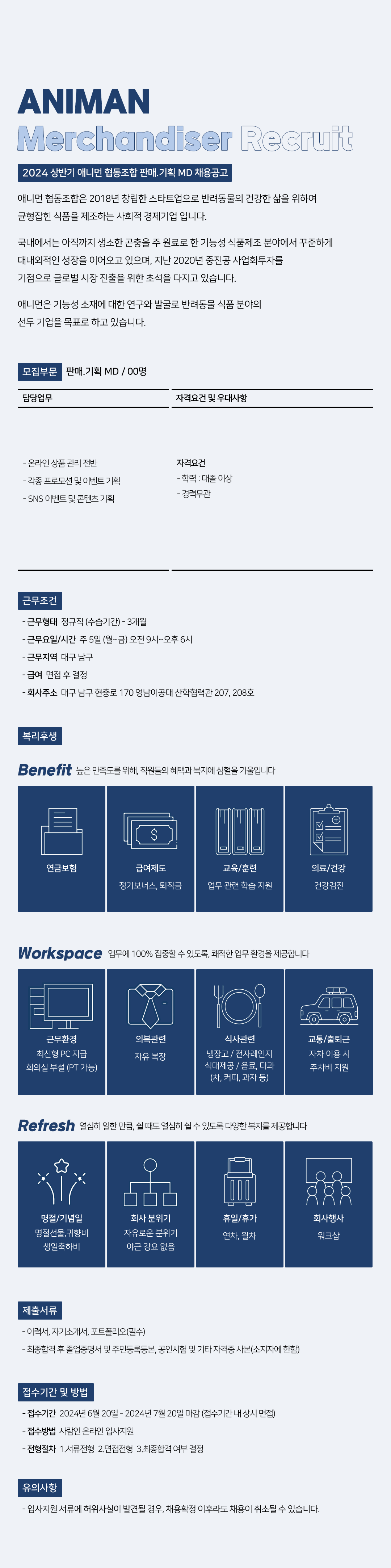 2024 애니먼협동조합 상반기 판매.기획 MD 채용공고작성자 : 강혁주 작성일 : 24-07-02