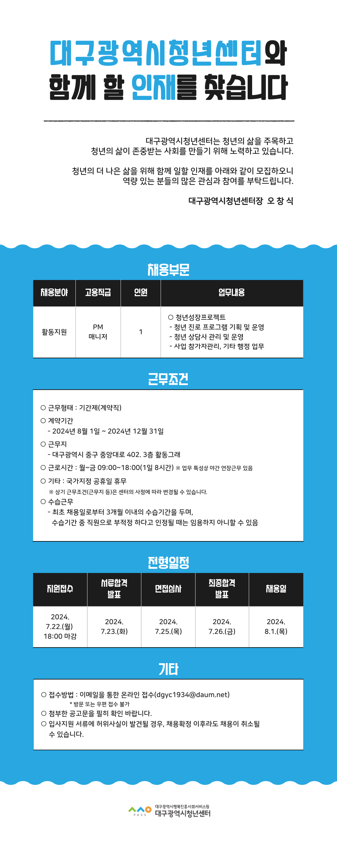 [제2024-05호] 대구광역시청년센터 인재채용 공고작성자 : 대구청년센터 작성일 : 24-07-12 대구광역시청년센터