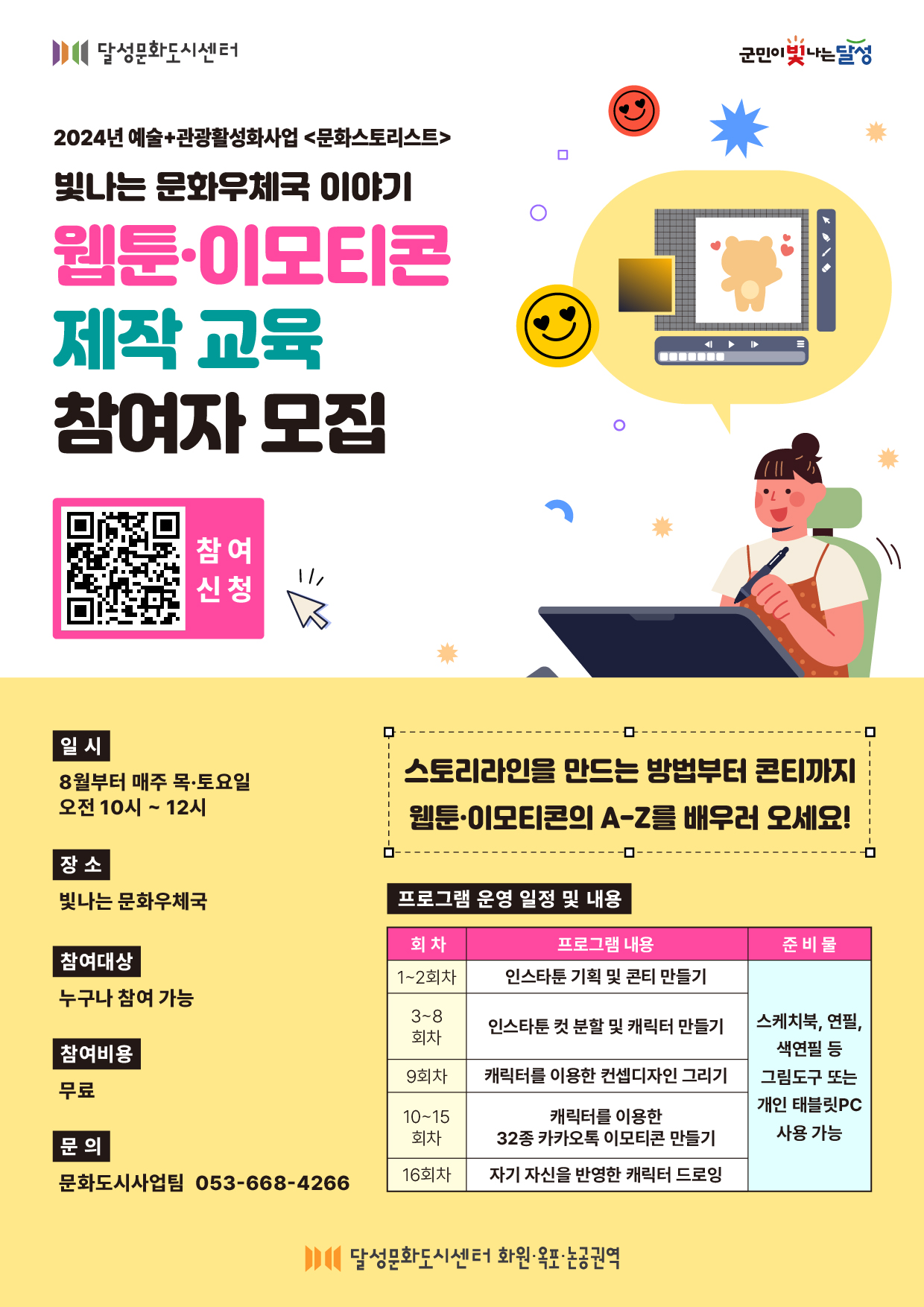 빛나는 문화우체국 이야기 웹툰/이모티콘 제작 교육 참여자 모집작성자 : 윤혜원 작성일 : 24-07-18