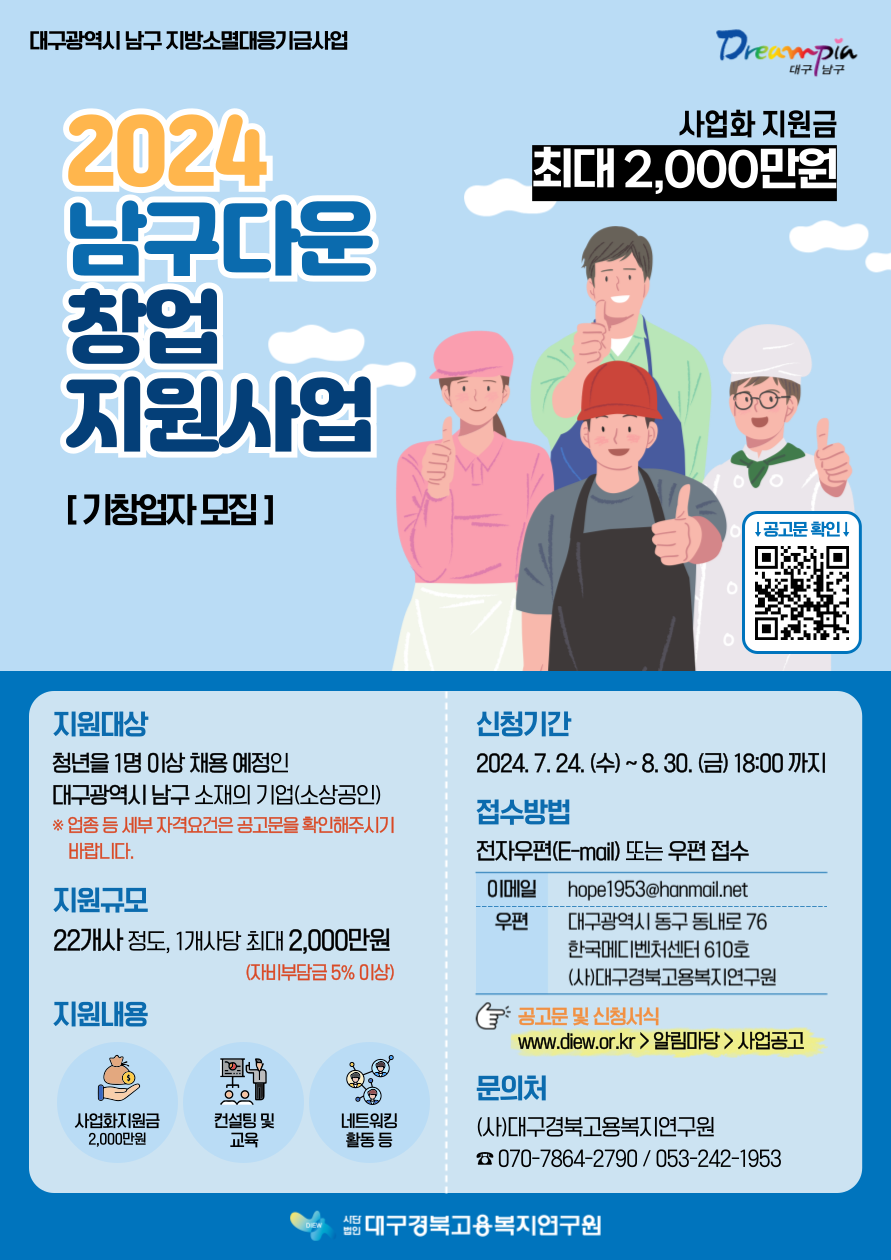대구광역시 남구의 청년 유입 및 생활인구 증가를 통해 지역 활성화를 위한 「2024년 남구다운 창업 지원사업」을 진행하고 있습니다. 자세한 사항은 공고문을 통해 확인해 주시길 바라며, 많은 관심과 참여 바랍니다.