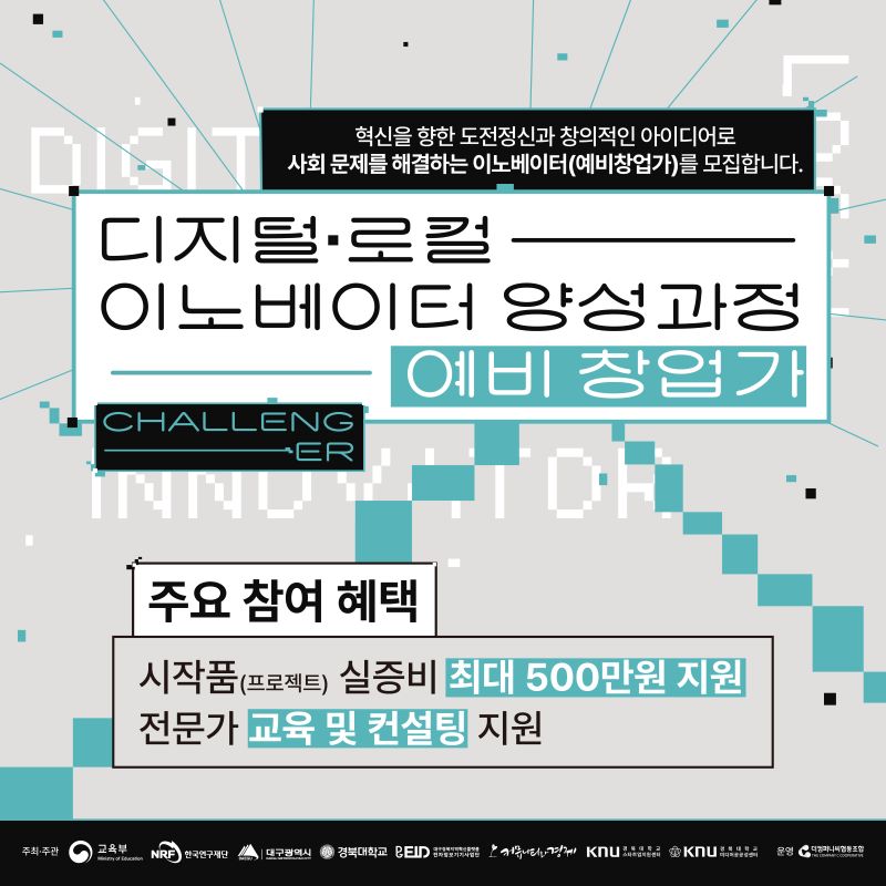 「지자체-대학 협력기반 지역혁신(RIS) 사업」의 일환으로 "디지털 로컬 이노베이터 양성 과정(예비 창업가)"을 시행하오니 관심 있는 분들의 많은 참여 바랍니다.