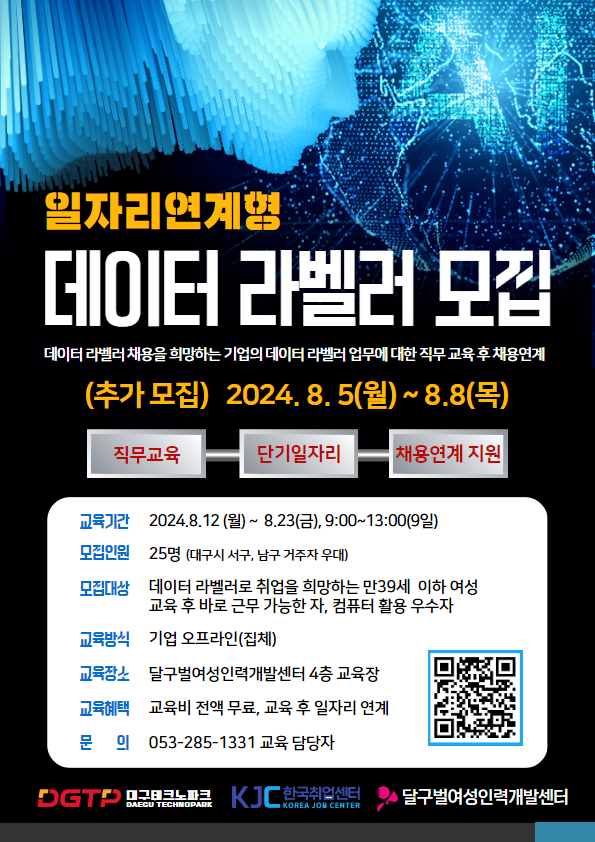 [한국취업센터] 일자리 연계형 데이터 라벨러 모집(직무교육, 단기일자리, 채용연계지원)작성자 : 정다겸 작성일 : 24-08-07