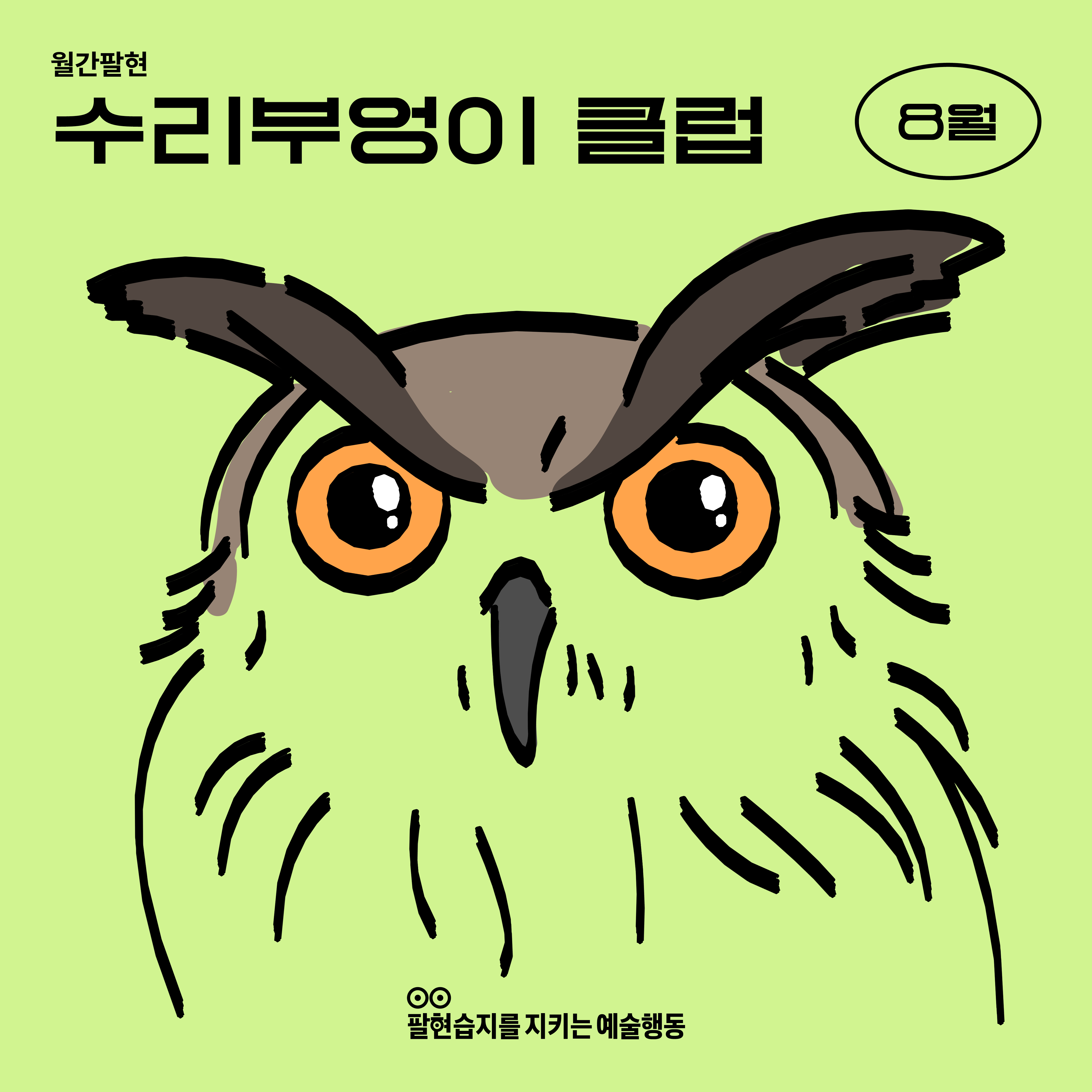 팔현습지를 상징하는 깃대종 수리부엉이의 이름을 붙인 ‘수리부엉이 클럽’은 팔현습지를 지키는 예술행동의 행동원이 진행하는 참여형 프로그램입니다. 이 프로그램은 더 많은 사람들이 팔현습지와 대구의 환경, 생태에 관심을 갖고 우리가 할 수 있는 실천에 대해 이야기를 나누며 더 나아가 미래세대에게 전할 수 있도록 보존을 위한 작은 움직임을 만들기 위해 시작하게 되었습니다.