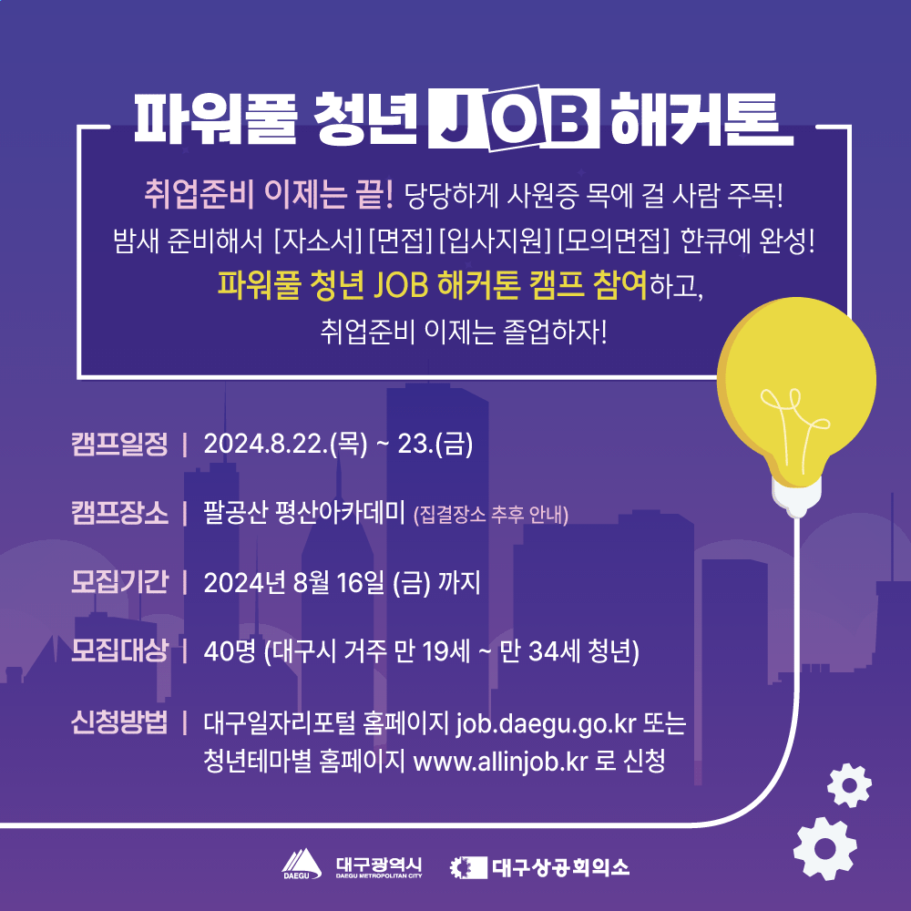 [2024년 청년테마별 취업지원사업 ] 파워풀 청년 JOB 해커톤 사상 최초! 해커톤 취업캠프 신청하고 꿈의 직장으로 GO!작성자 : 신동열 작성일 : 24-08-21