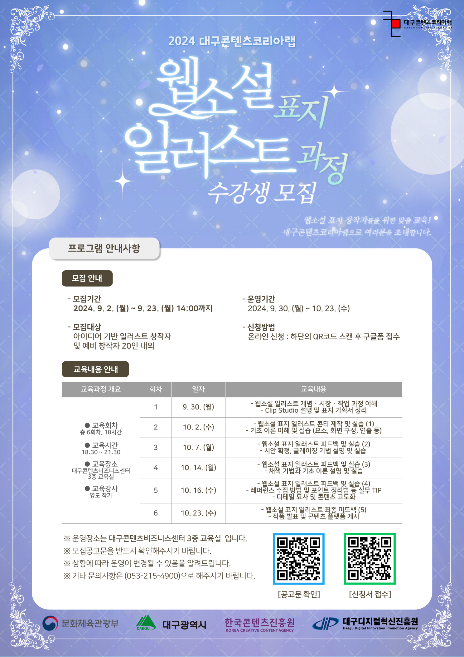 2024년 대구콘텐츠코리아랩 크리에이터 아카데미 웹소설 표지 일러스트 과정 참가자 모집작성자 : 신은경 작성일 : 24-09-02