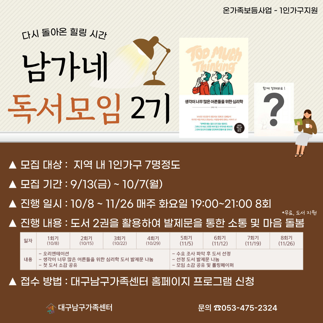 #대구남구가족센터 #온가족보듬사업 #1인가구지원사업 #1로만난사이 #원하는대로 #남가네 #독서모임 #청년 #1인가구