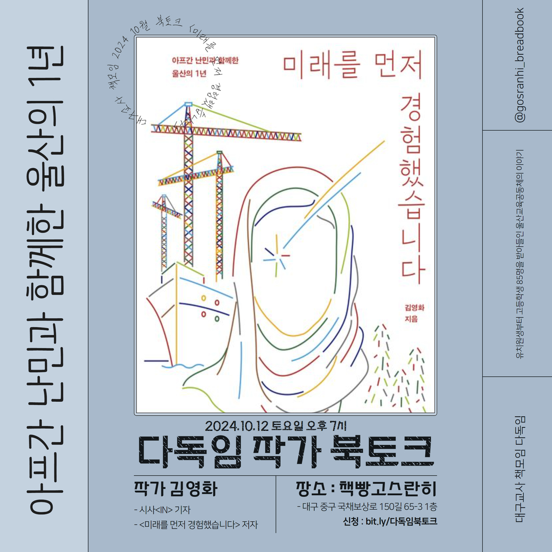 안녕하세요, 대구교사 책모임 <다독임>입니다. 2024 하반기 북토크 <미래를 먼저 경험했습니다> 작가 북토크를 준비했습니다. 2021년 8월 '미라클 작전'으로 카불에서 구출한 아프간 특별기여자들이 울산이라는 새로운 곳에 정착하였습니다. 많은 우여곡절이 있었으나 아프간 난민을 이웃으로 받아들인 울산. 그 1년의 과정을 취재한 이야기를 책으로 엮어낸 <미래를 먼저 경험했습니다> 작가, 김영화 기자님을 모시고 북토크를 준비했습니다. 많은 관심과 신청 바랍니다.