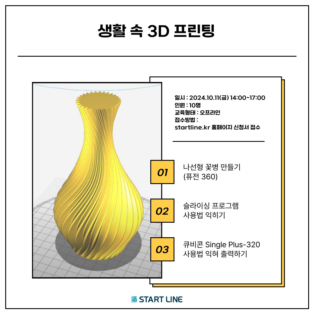 안녕하세요 스타트라인입니다.📢 메이커스페이스 전문랩 스타트라인에서 '생활속 3D프린팅' 교육을 진행합니다.😊