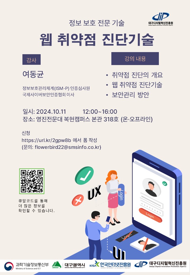 2024년 정보보호 전문교육을 9월 20일부터 11월 15일까지 매주 금요일 오후 2시에 대구디지털혁신진흥원에서 진행합니다.