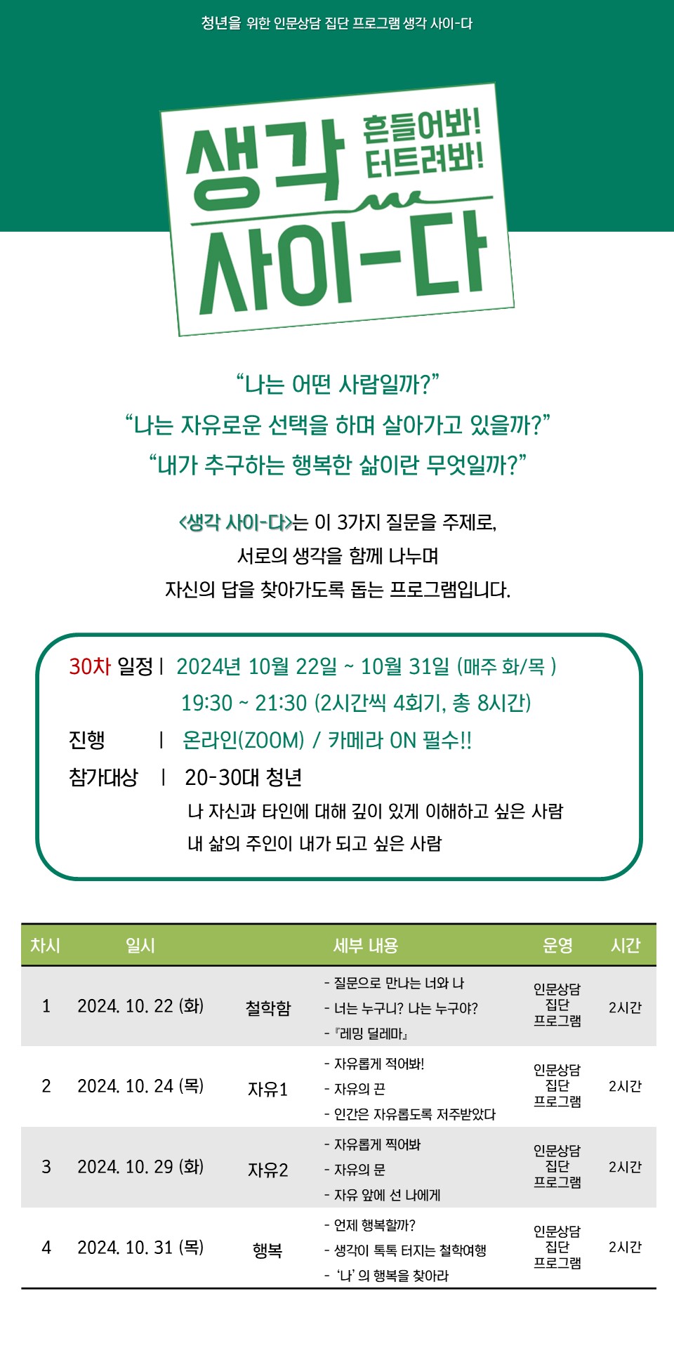 청년 인문상담프로그램 <생각 사이-다> 30기 모집작성자 : 차지혜 작성일 : 24-10-08