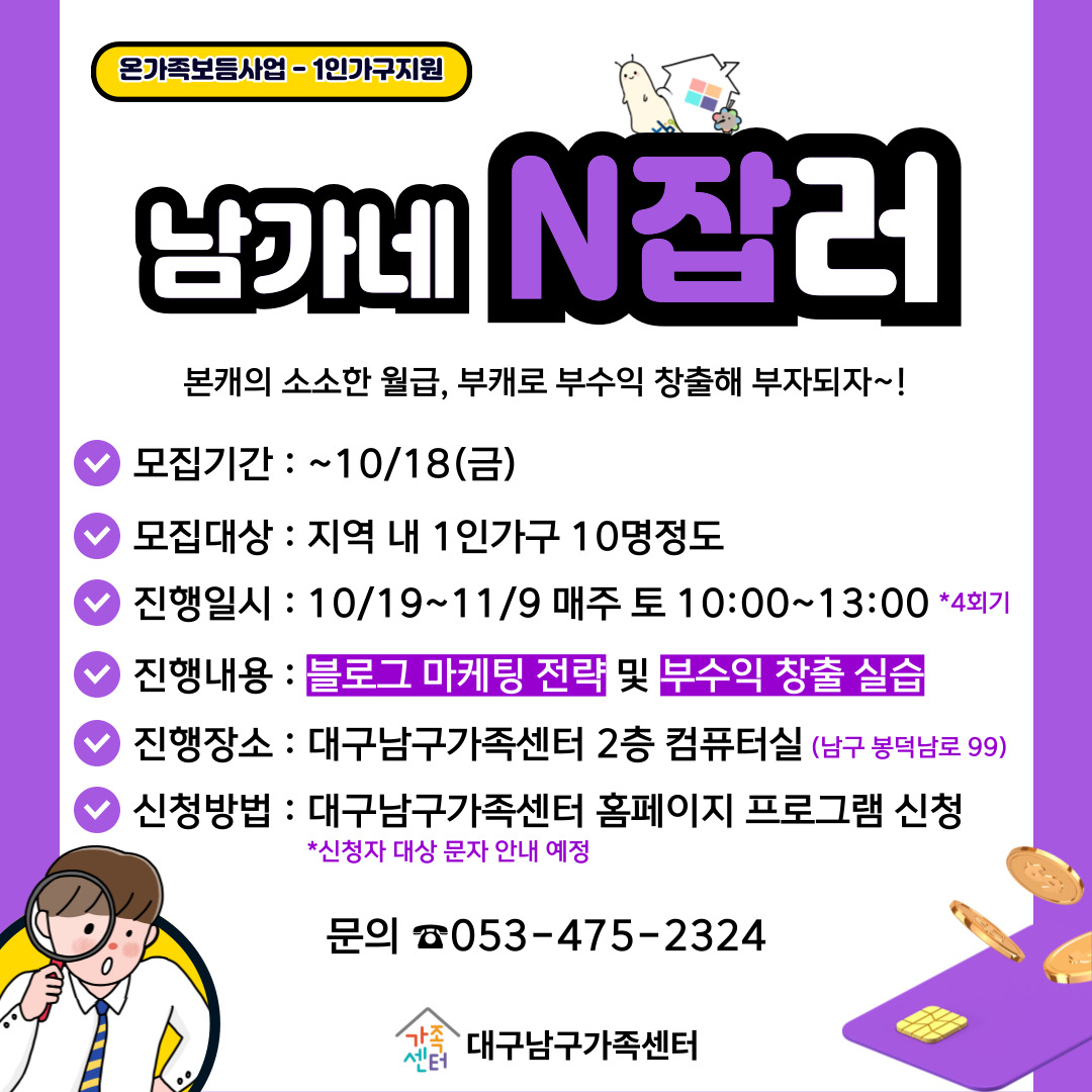 #대구남구가족센터 #온가족보듬사업 #1인가구사회적관계망형성지원사업 #1로만난사이 #원하는대로 #남가네 #N잡 #1인가구