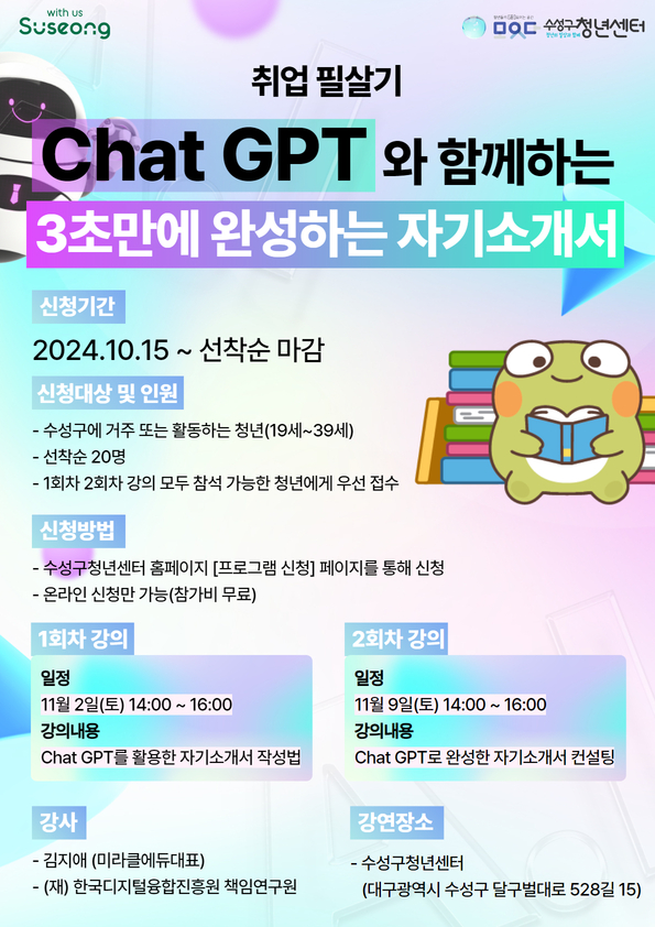 Chat GPT와 함께하는 '3초'만에 완성하는 자기소개서작성자 : 수성구청년센터 작성일 : 24-10-15