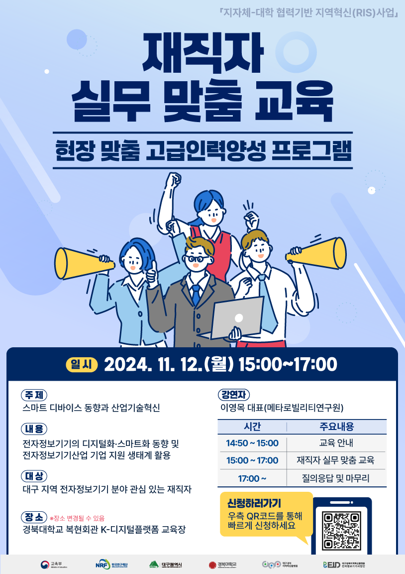 「지자체-대학 협력기반 지역혁신(RIS) 사업」의 일환으로 "재직자 실무 맞춤 교육"을 시행하오니 관심 있는 분들의 많은 참여 바랍니다.