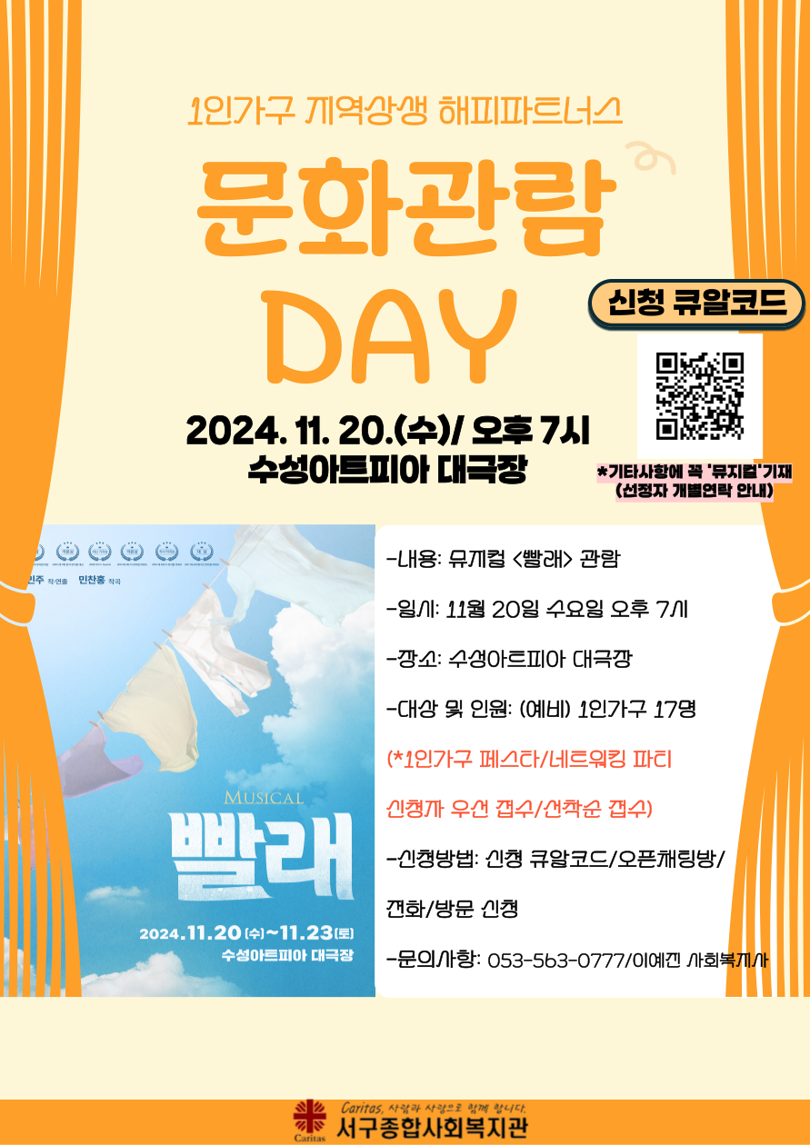 [서구종합사회복지관] 11월 문화관람DAY 뮤지컬<빨래> 관람 참여자 모집작성자 : 이예진 작성일 : 24-11-13