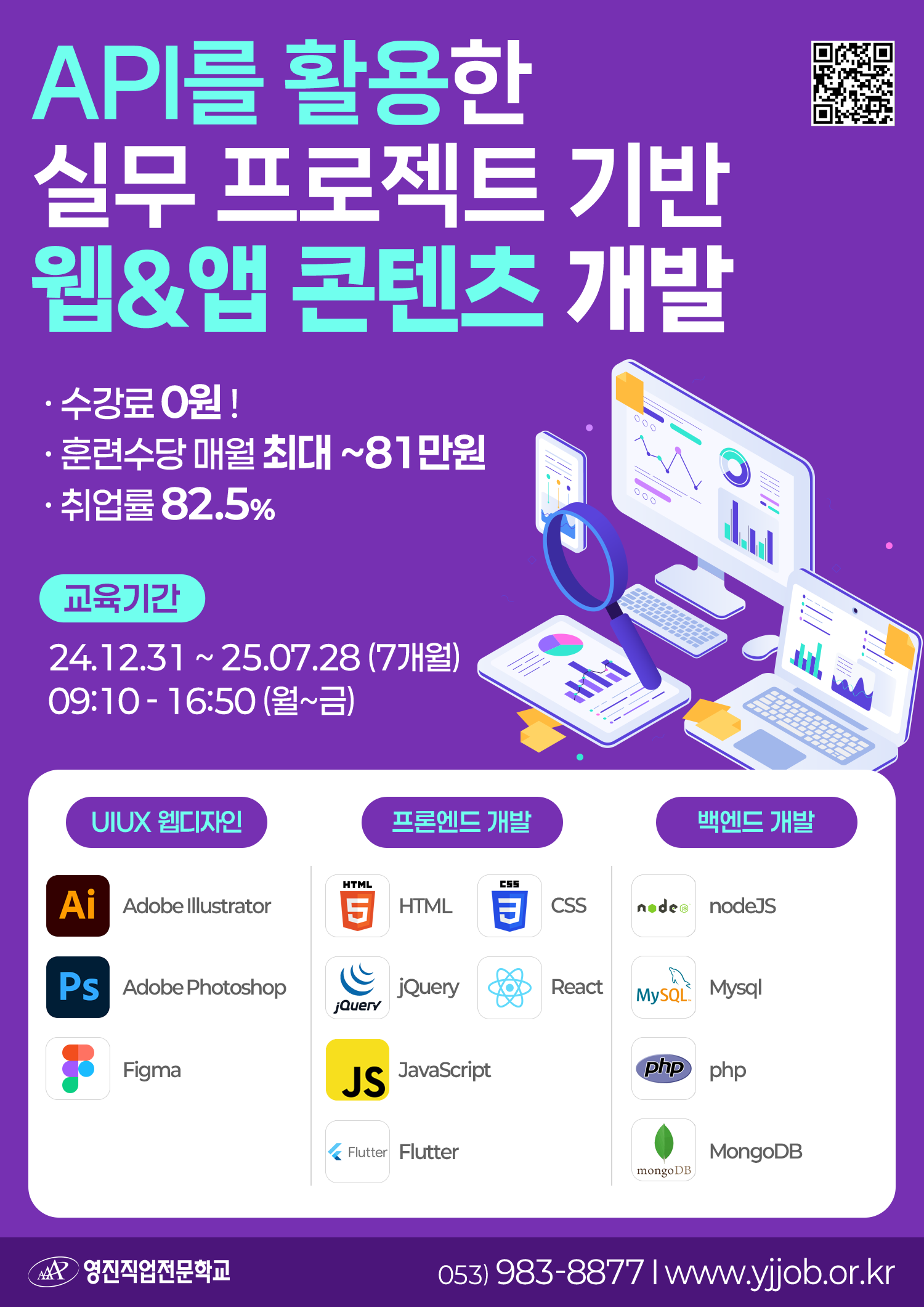 특히, 취업률은 82.5%이상에 달하며, 실무 프로젝트를 통해 비전공자도 웹&앱 개발자로 취업할 수 있는 기회를 제공합니다.