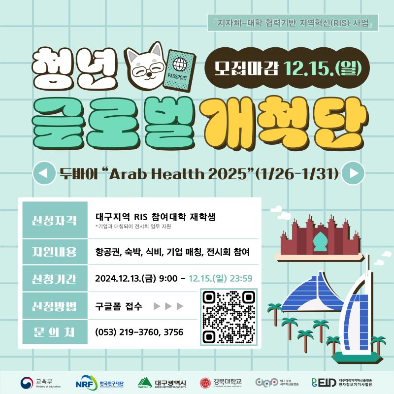 「지자체-대학 협력기반 지역혁신(RIS) 사업」의 일환으로 "청년 글로벌 개척단(Arab Health 2025) 사업"을 시행하오니 관심 있는 분들의 많은 참여 바랍니다.