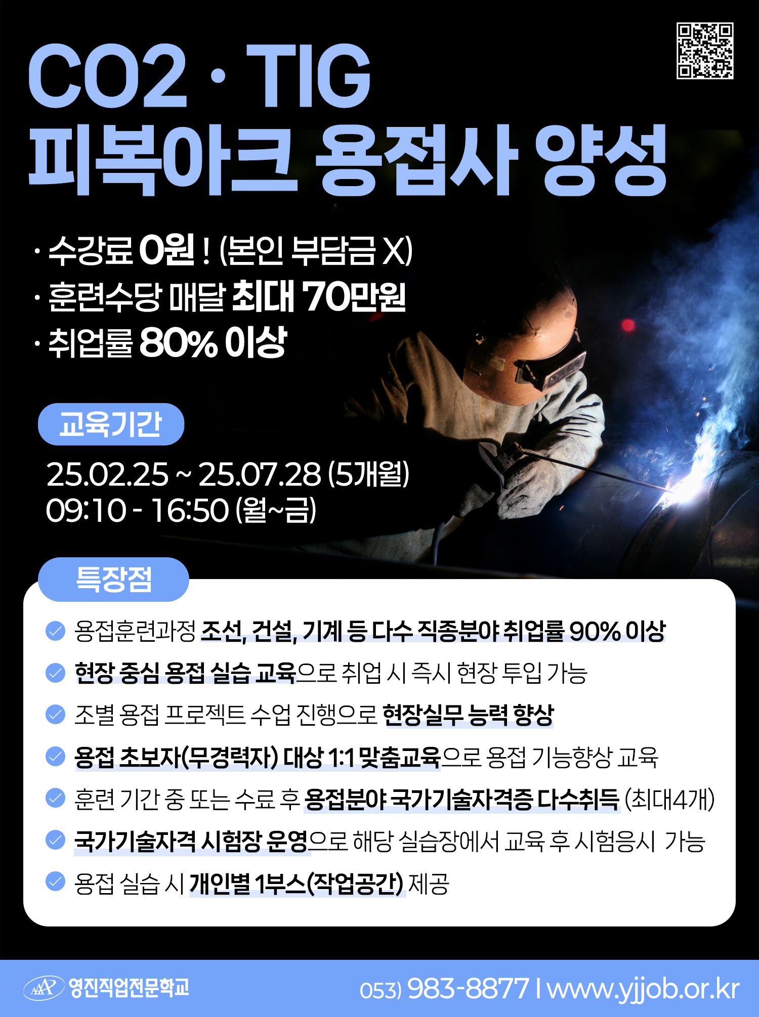 취업률 80%이상, 현장실무 교육을 통해 비전공자라도 용접의 전문성을 갖고 취업할 수 있으니 지금 바로 지원해보세요!